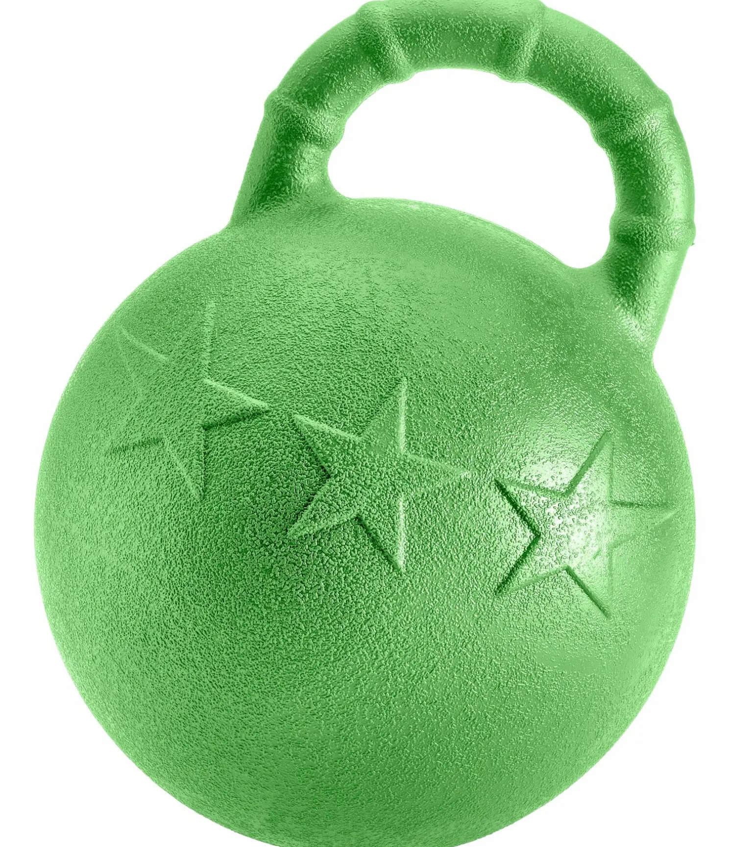 Balle de jeu pour cheval en matériau résistant et durable, décorée de moulages étoiles. Poignée particulièrement solide. Pas besoin de pompe ! La valve spéciale permet à l’air de s’évacuer lorsque le cheval mord la balle puis à la balle de se remplir d’air toute seule. Ø 26 cm.