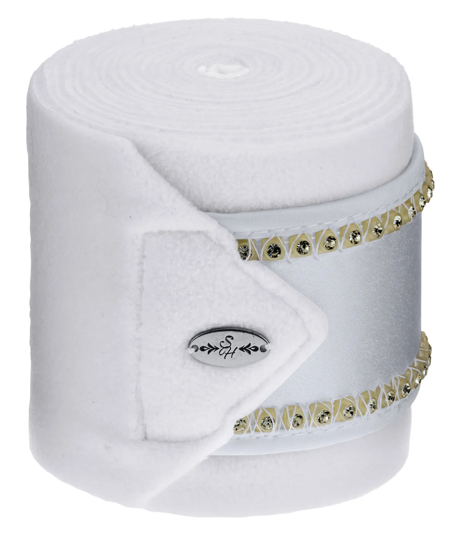 Bandes de polo en polaire. Passepoil avec strass sur la fermeture des bandes. Patte auto-agrippante pour un maintien sûr. 100 % polyester. F (cheval) : 300 x 10 cm, P (poney) : 200 x 8 cm. Vendues par lot de 4.