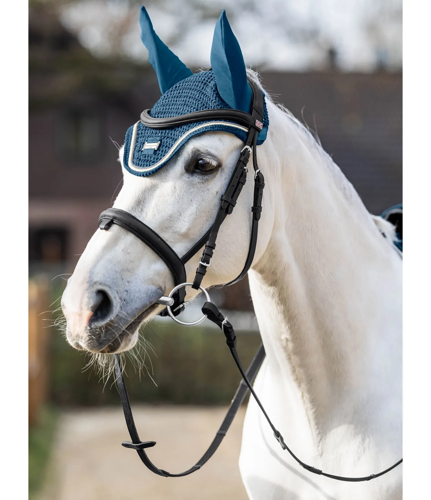 Bonnet anti-mouches à mailles larges avec double cordon décoratif subtil et brillant de couleur contrastante et petite plaque métallique centrée avec logo Felix Bühler. Matière extensible aux oreilles pour un confort optimal et pattes auto-agrippantes pour une fixation sûre au bridon. 97 % polyester, 3 % élasthanne.