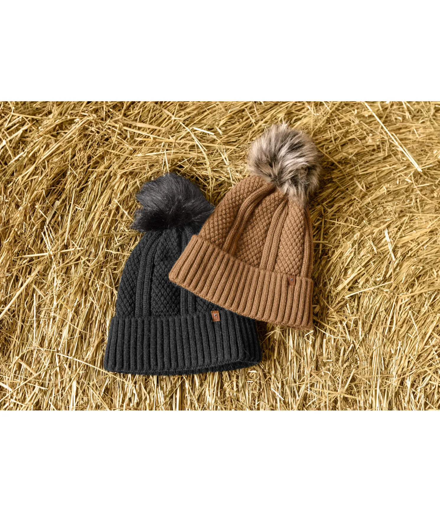 Bonnet à revers en maille avec pompon en fourrure synthétique. Doublure intérieure en polaire chaude. 100 % polyacrylique, doublure 100 % polyester.