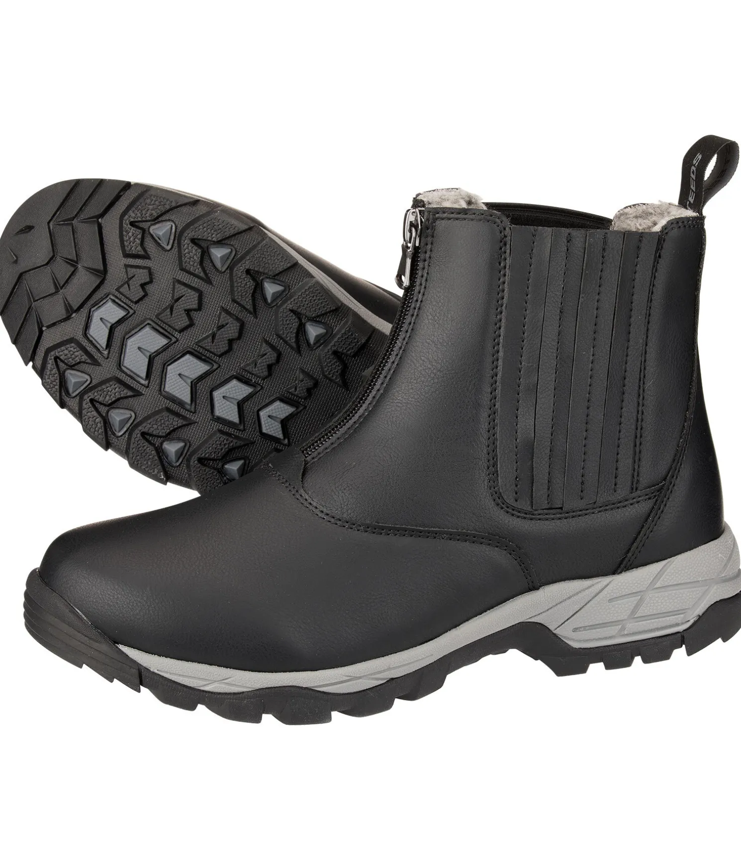 Bottines robustes doublées de polaire chaude (100 % polyester). Fermeture à glissière à l’avant. Soufflet élastiqué de chaque côté de la bottine et languette à l’arrière pour faciliter l’enfilage et le retrait. Assise plantaire confortable grâce à la semelle double épaisseur (semelle intermédiaire souple en EVA et semelle extérieure antidérapante en caoutchouc). Synthétique (PU).