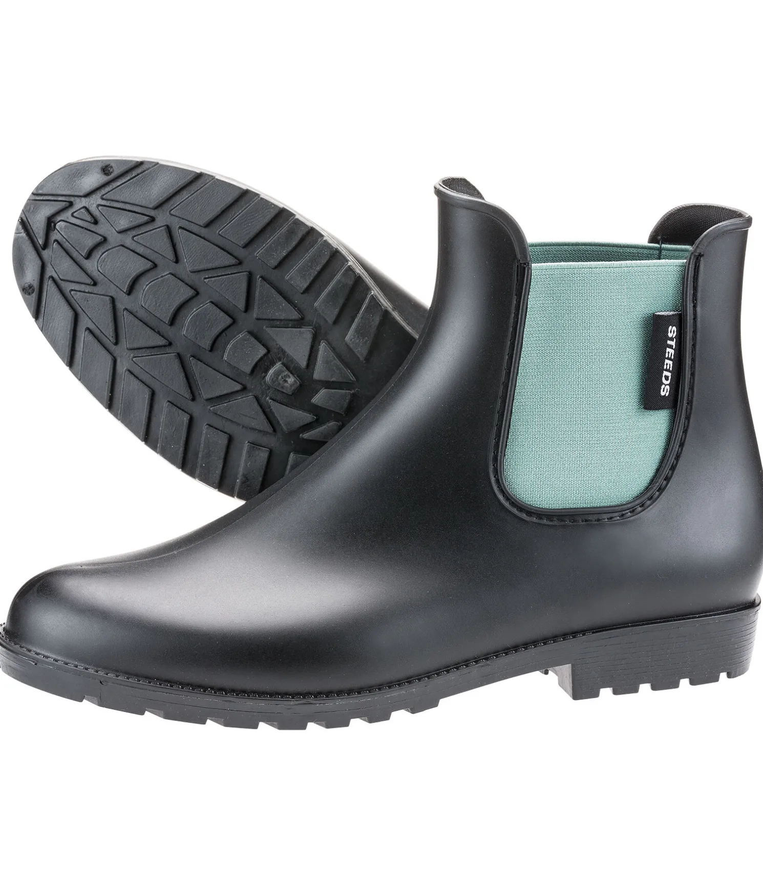 Bottines en PVC sans doublure. Avec talon cavalier et semelle extérieure antidérapante. Empiècements élastiques latéraux permettent un enfilage facile.