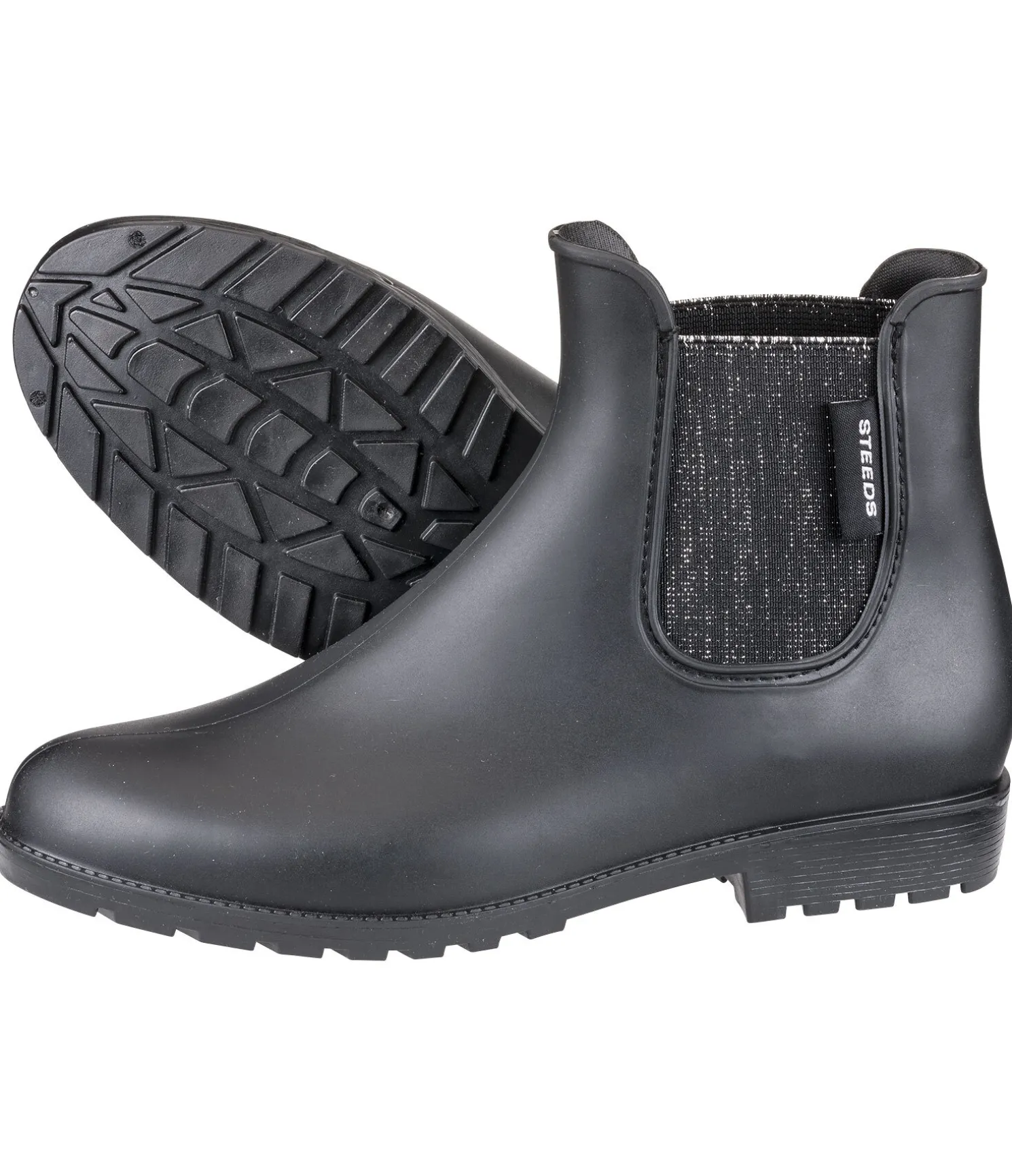 Bottines en PVC sans doublure. Avec talon cavalier et semelle extérieure antidérapante. Empiècements élastiques latéraux permettent un enfilage facile.