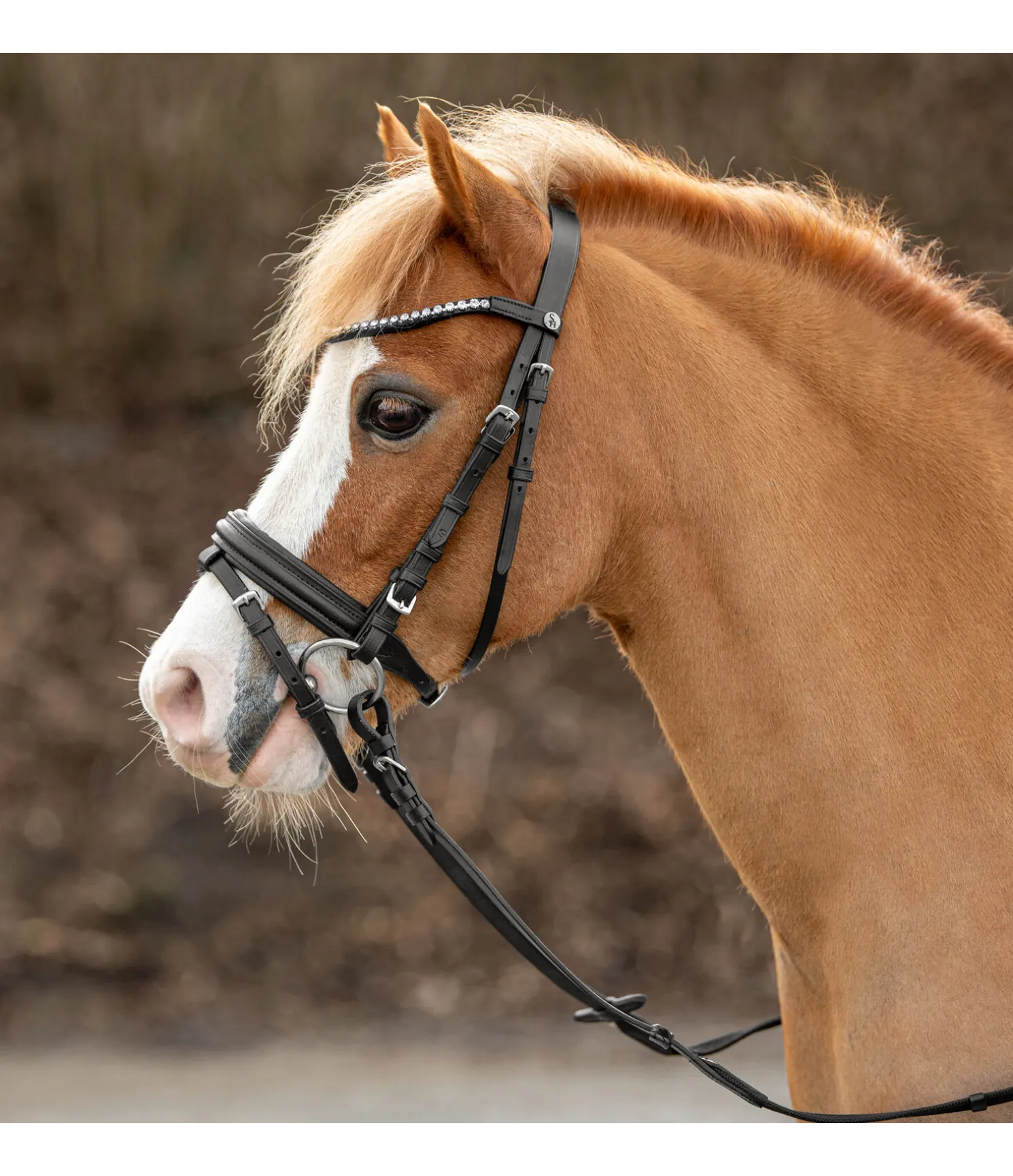 Bridon avec muserolle française combinée et frontal vague avec strass. La doublure douce de la muserolle offre un confort optimal. En cuir véritable. Bouclerie argentée. Sans rênes et sans mors.