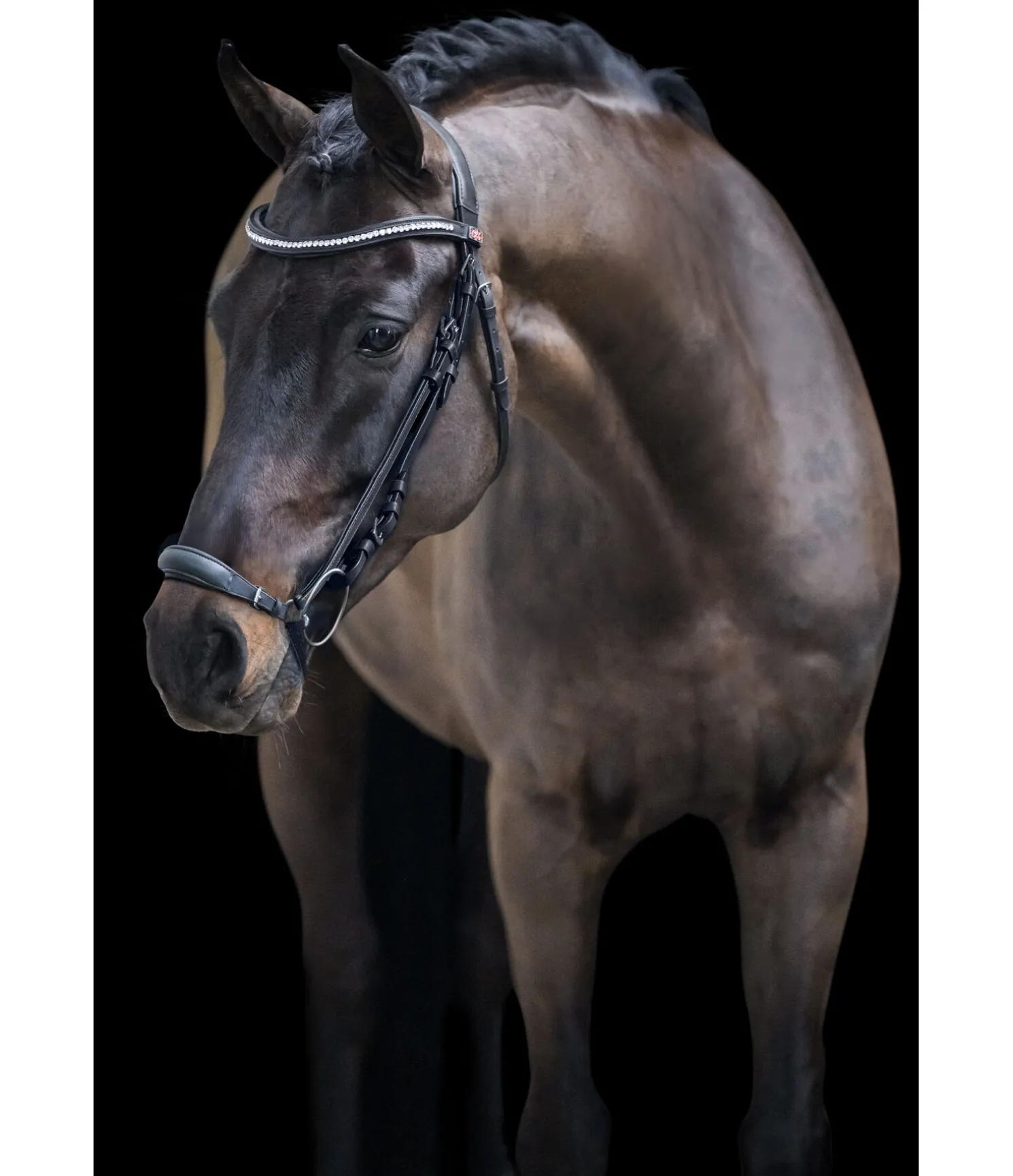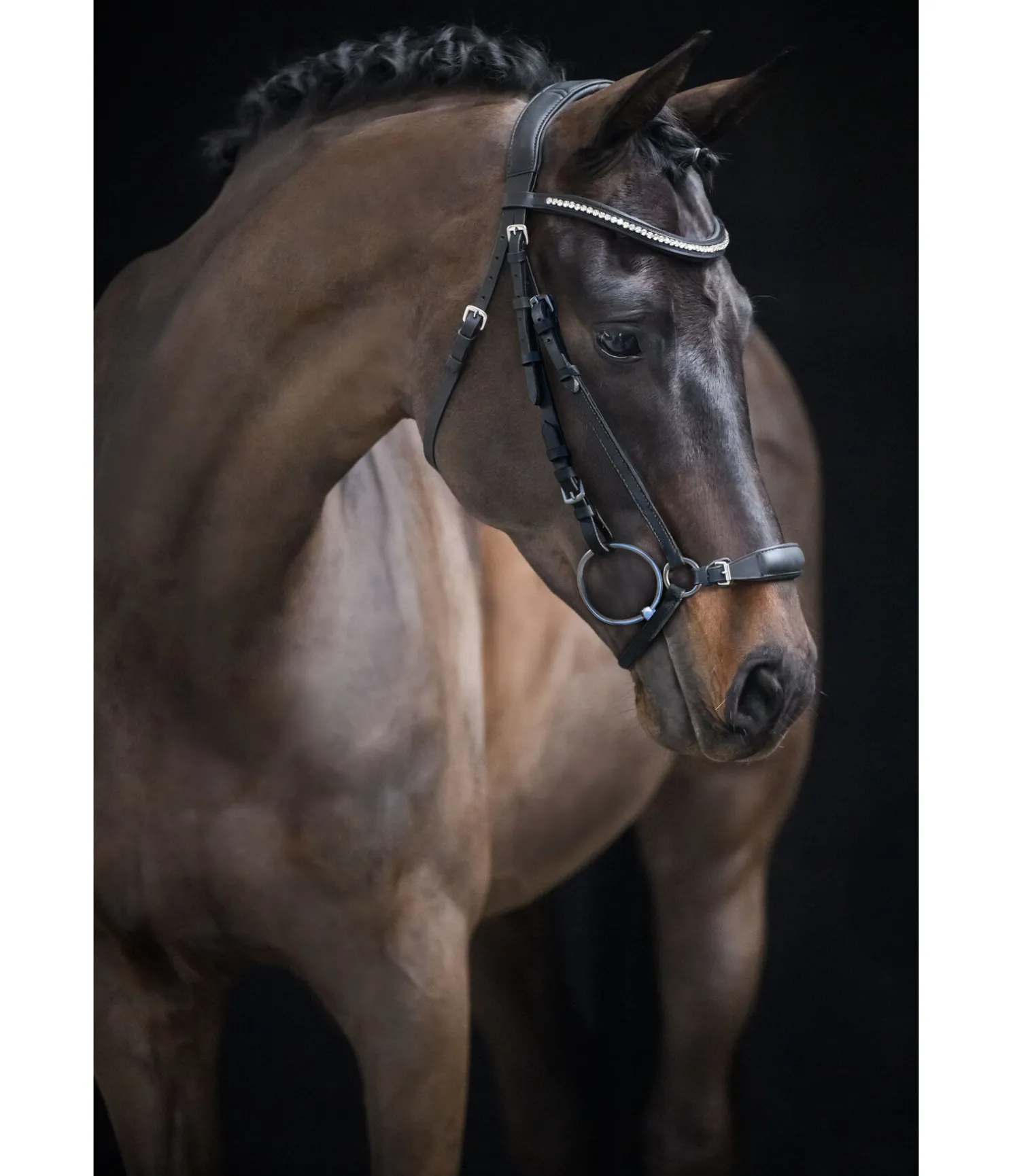 Bridon particulièrement souple avec muserolle allemande. Têtière anatomique. Frontal vague orné de strass. Têtière, frontal, muserolle et pad de menton avec doublure douce en cuir véritable. Muserolle réglable. Bouclerie argentée. Sans rênes sangle, sans mors.