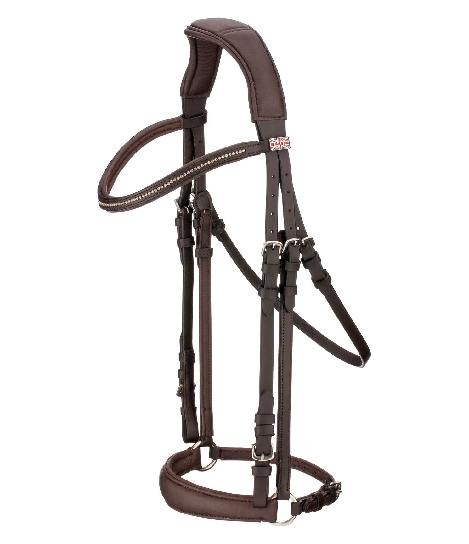 Bridon particulièrement doux avec muserolle allemande. Têtière anatomique. Frontal vague orné de petits strass scintillants. Têtière, frontal et muserolle avec doublure moelleuse en cuir véritable. Bouclerie argentée. Sans rênes et sans mors.