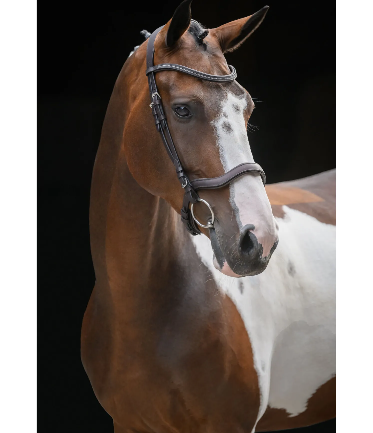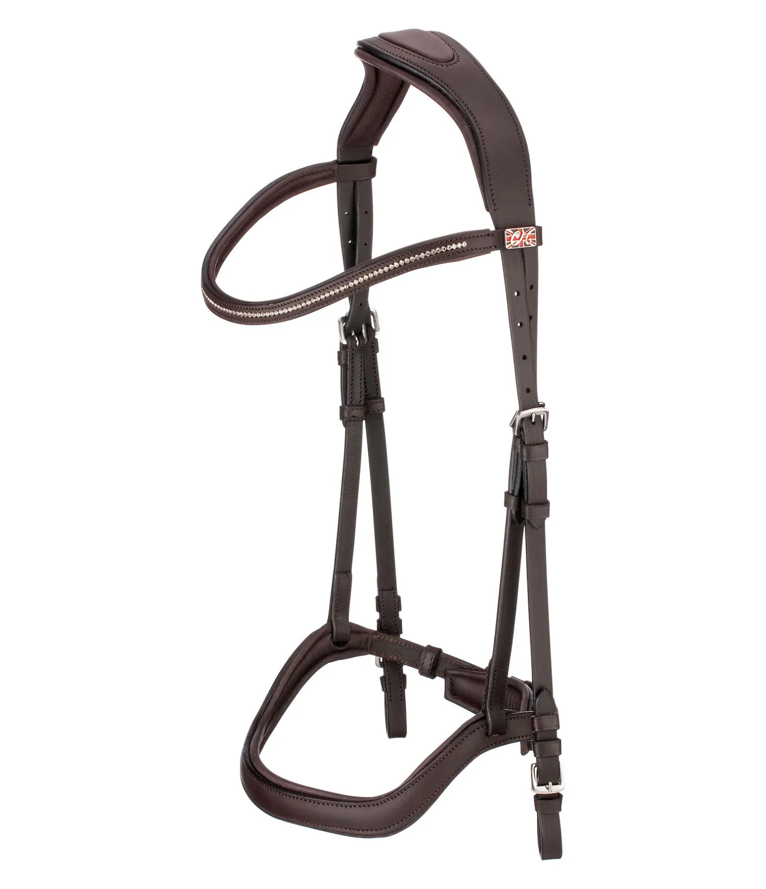 Bridon épuré avec têtière et muserolle anatomiques. Muserolle ergonomique permettant d’éviter les pressions sur les nerfs faciaux sensibles, au niveau des zygomatiques ainsi que sur la mâchoire et les dents. Doublure douce en cuir véritable. Sans noseband ni sous-gorge pour favoriser la mastication. Frontal vague classique avec strass. Bouclerie argentée. Rênes et mors non inclus.