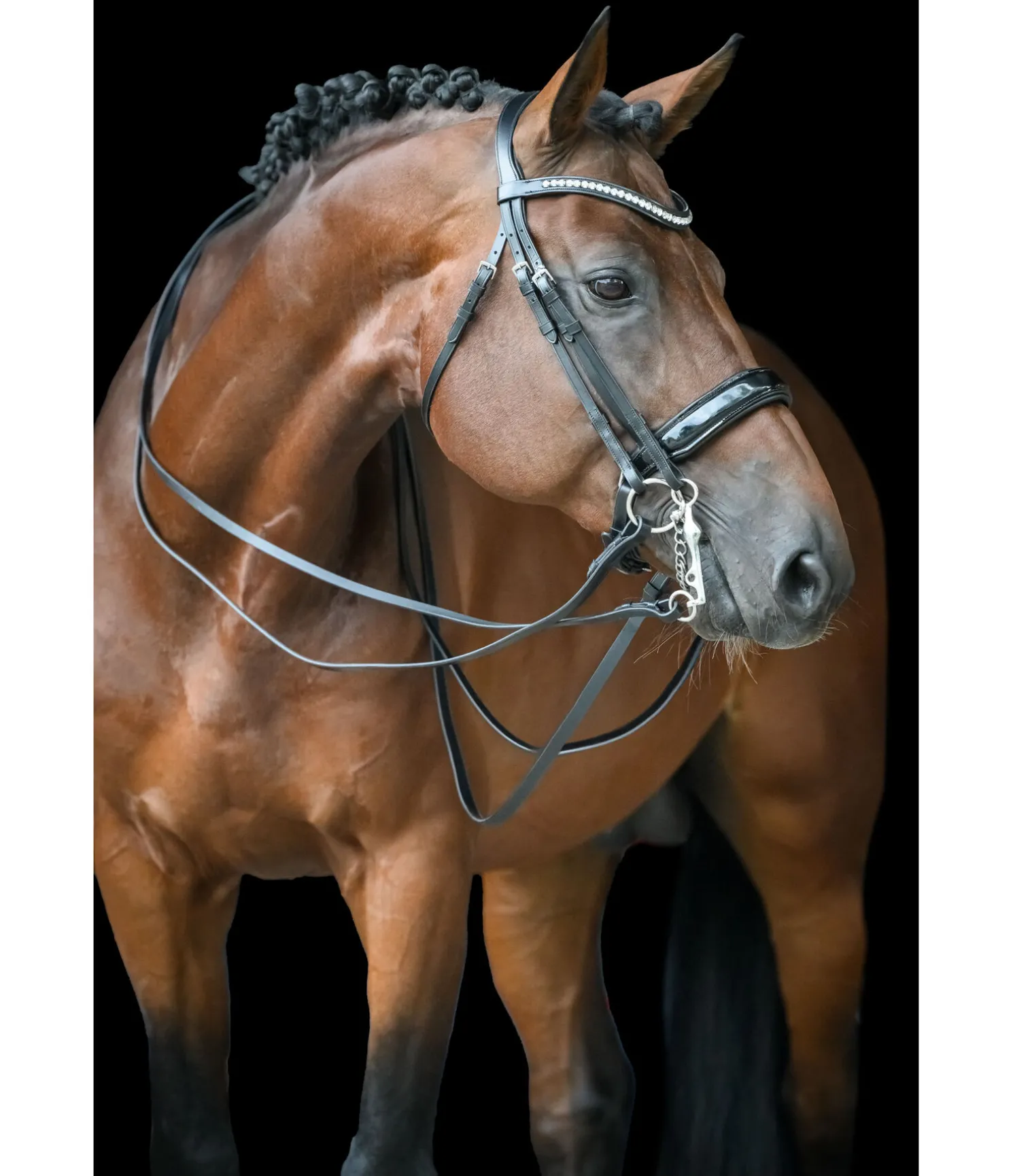 Bridon en cuir gras de qualité supérieure avec muserolle suédoise anatomique qui, grâce à sa coupe, offre plus de place au mors de bride. Le cuir travaillé avec soin est particulièrement doux et souple. Il assure une répartition optimale de la pression et l’allège au mieux au niveau des oreilles, de la première vertèbre cervicale et du chanfrein. Pad de menton avec doublure douce. Frontal vague avec strass blancs. La muserolle en cuir verni est le point fort de ce bridon. Il est également doublé d’un rembourrage en cuir doux véritable. Porte-mors à crochets. Avec rênes, sans mors.