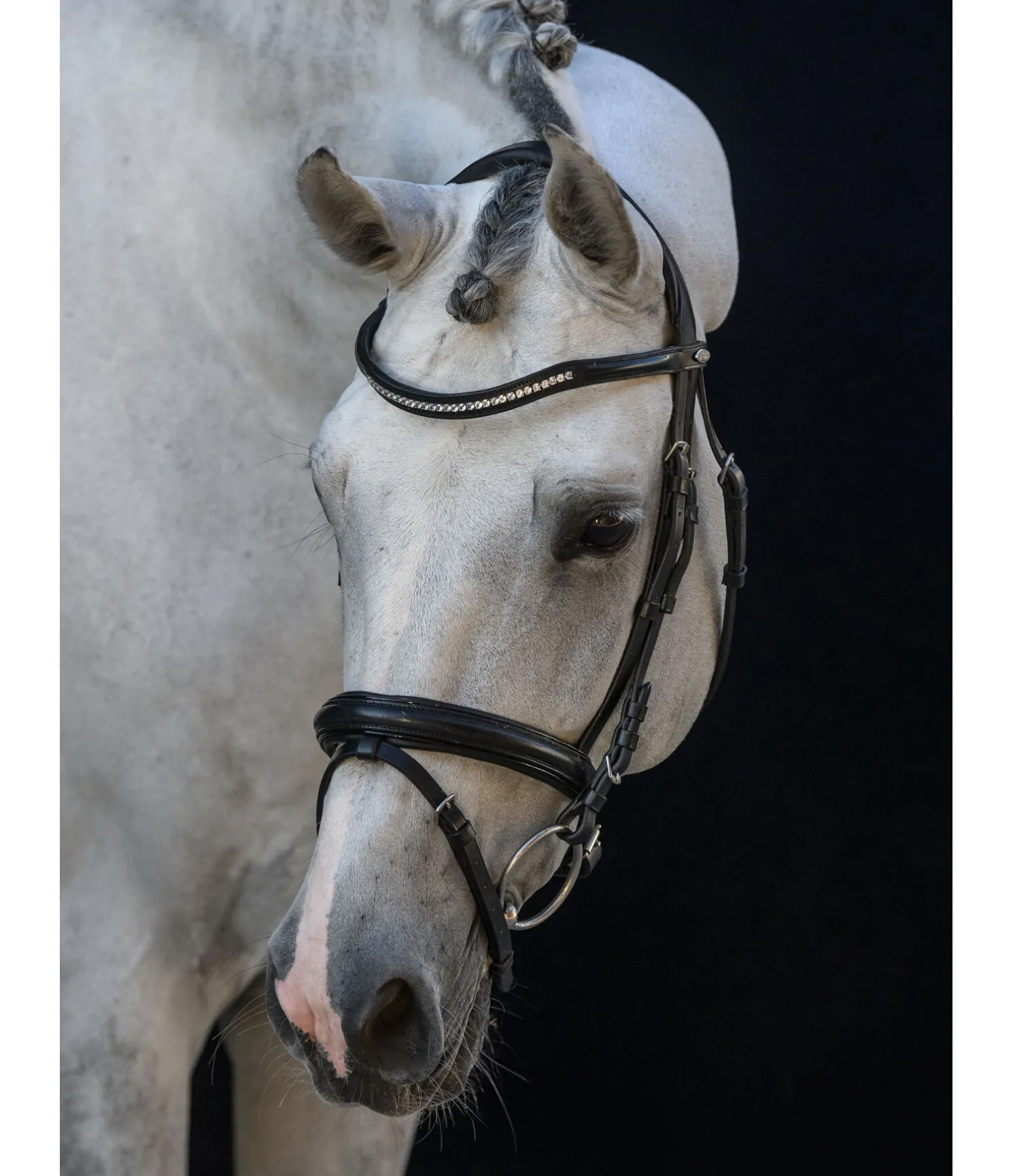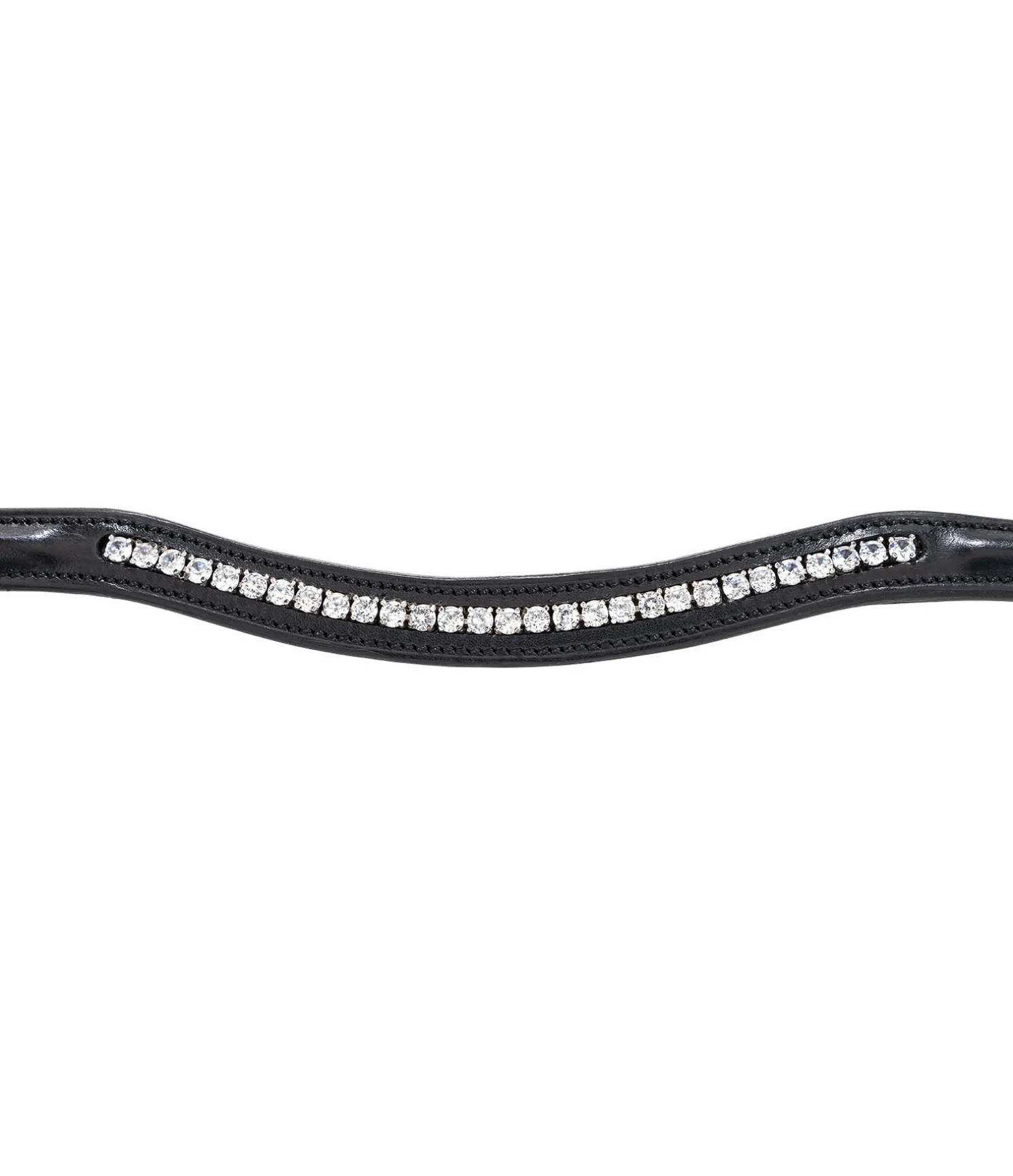 Muserolle classique française combinée avec têtière extra souple de forme anatomique. Frontal vague orné de strass au centre. Jonc en cuir verni sur la muserolle. Sans rênes, sans mors. Cuir véritable. Bouclerie argentée.