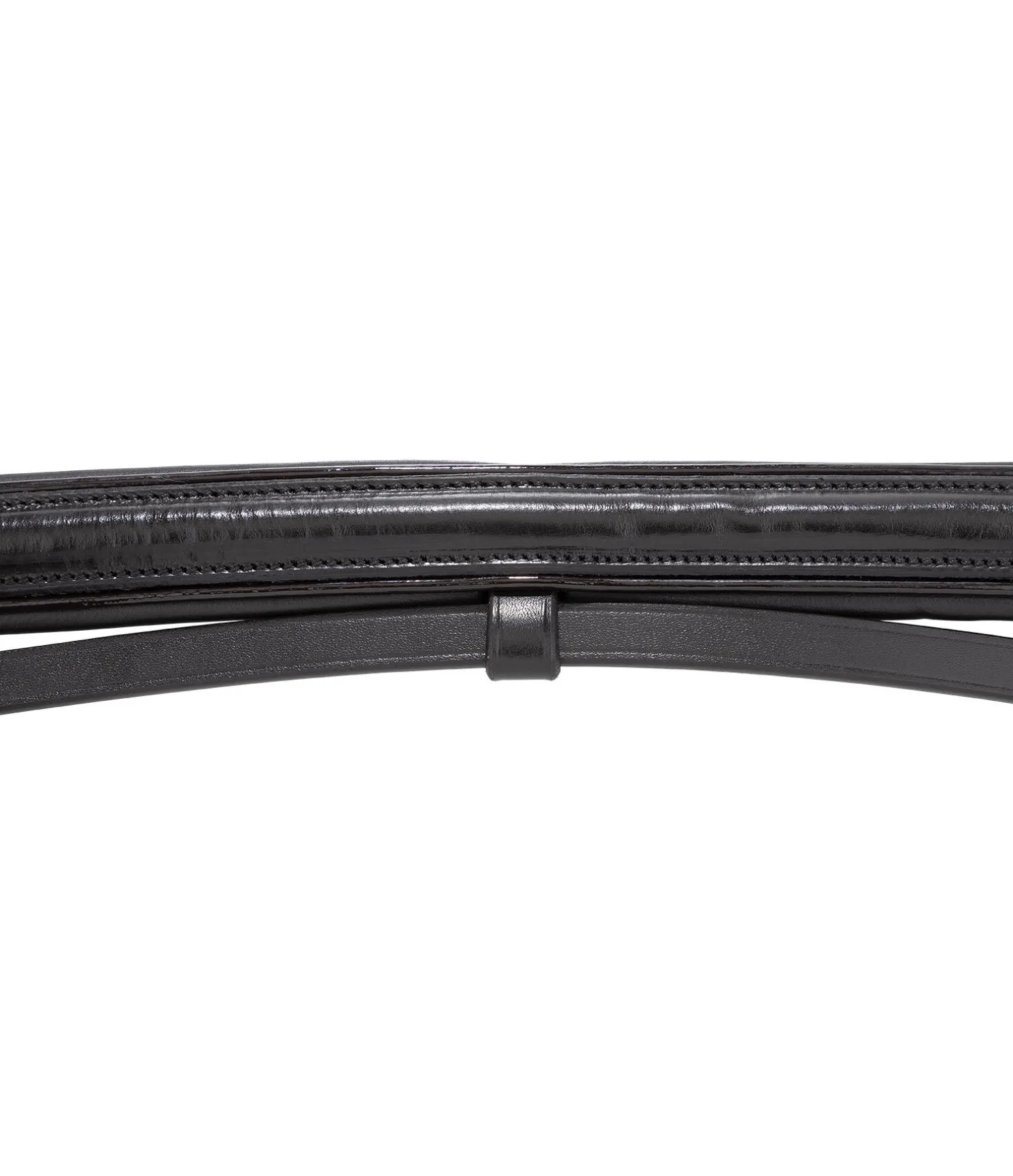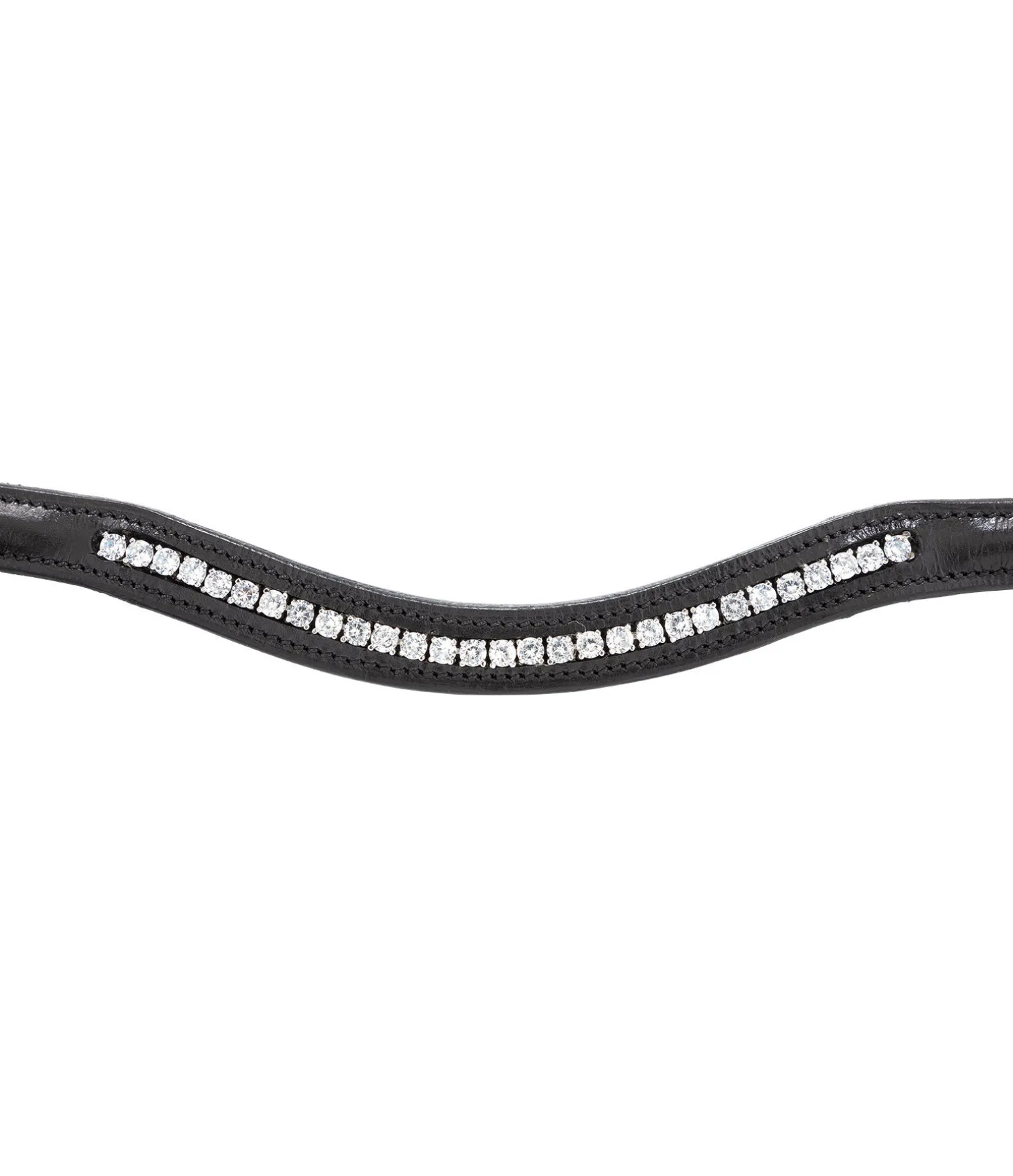 Muserolle classique française combinée avec têtière extra souple de forme anatomique. Frontal vague orné de strass au centre. Jonc en cuir verni sur la muserolle. Sans rênes, sans mors. Cuir véritable. Bouclerie argentée.