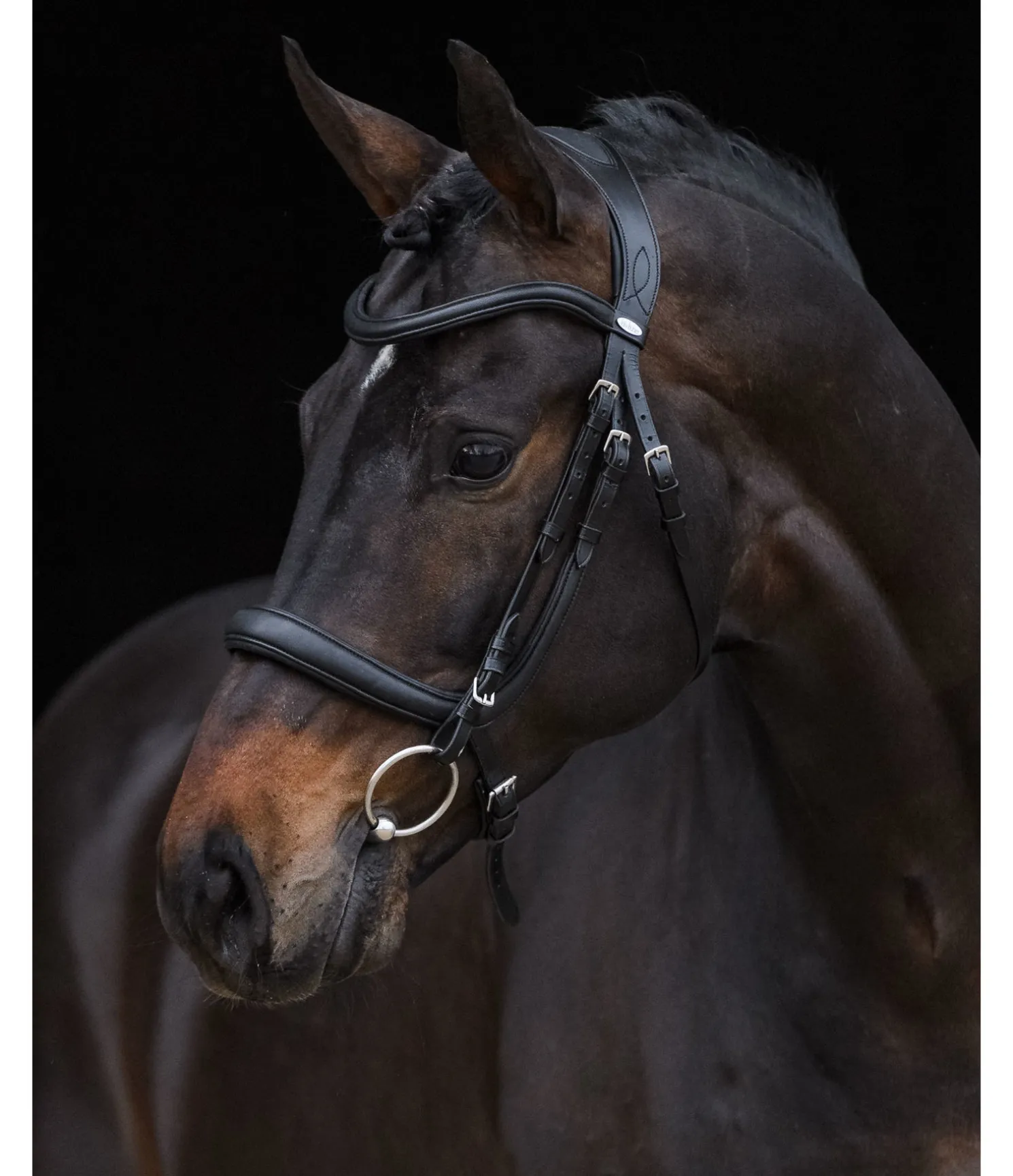 Bridon moderne en cuir souple combinant les effets d’une muserolle française et d’une muserolle allemande, ce qui permet d’éviter les pressions sur les nerfs sensibles de la tête du cheval au niveau de l’apophyse zygomatique, sur les dents et la mâchoire. Sans noseband, afin d’éviter les pressions sur l’os du nez et de favoriser la mastication. Têtière extra large avec découpe aux oreilles et doublure douce en cuir véritable. Muserolle et frontal vague en cuir souple travaillé avec doublure, particulièrement doux et confortables. Cuir gras. Bouclerie argentée. Sans rênes, sans mors.
