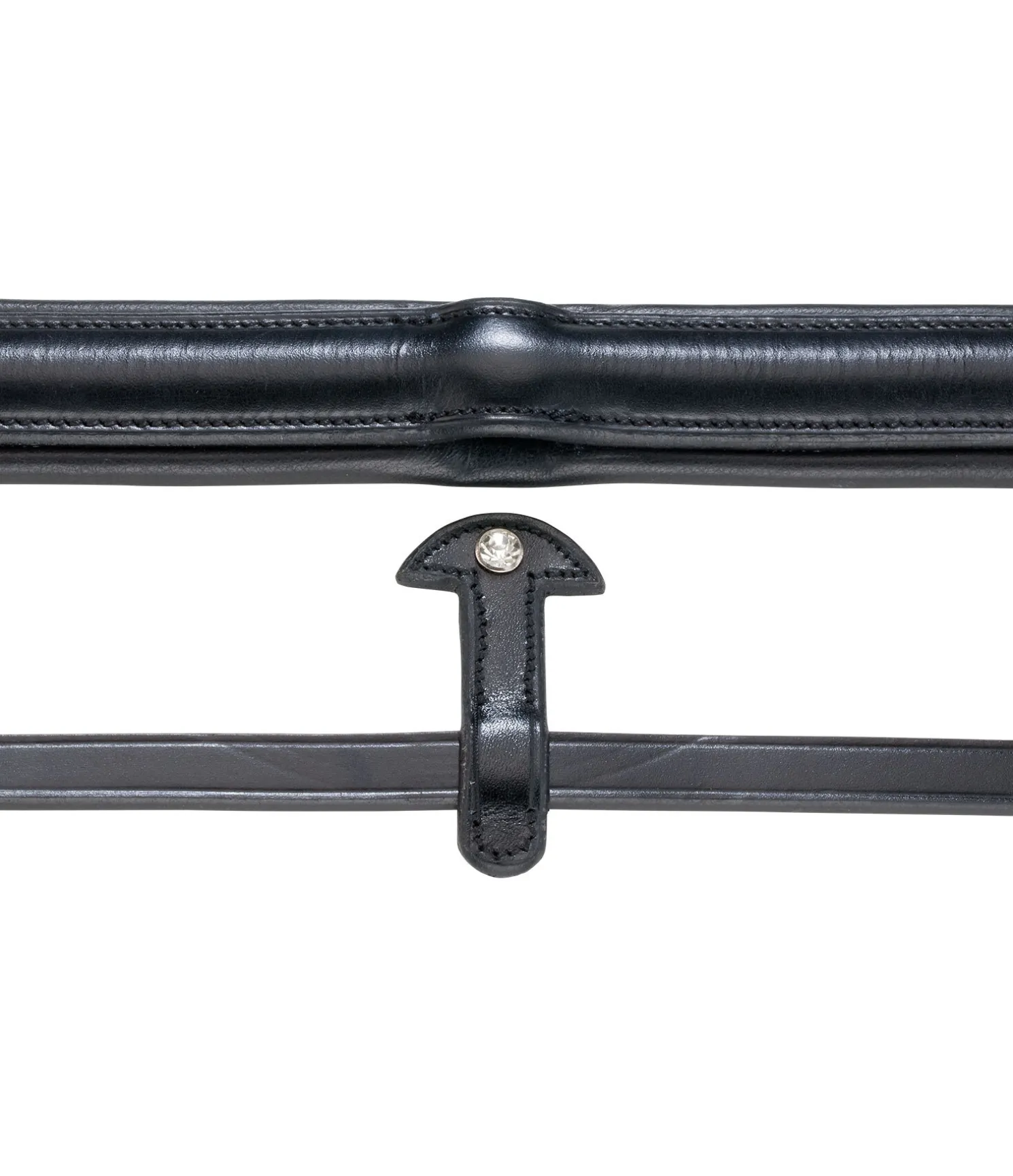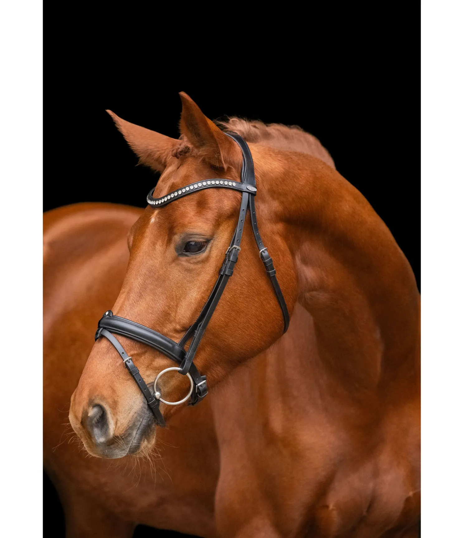 Bridon classique française combiné en cuir véritable souple. Noseband entièrement amovible avec pierre scintillante. Têtière anatomique extra souple et frontal vague avec strass.