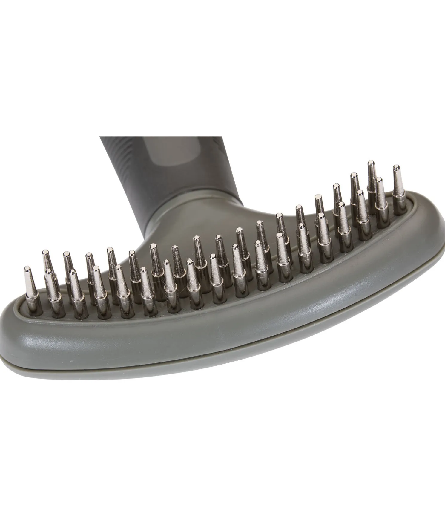 Les deux rangées de picots en métal à bouts arrondis sont assez mobiles pour s’adapter à toutes les morphologies et obtenir un effet massant. La brosse permet aussi de retirer sans effort l’excès de sous-poil et les poils morts. Prise en main optimale grâce au caoutchouc sur les côtés. 17 x 10 cm.