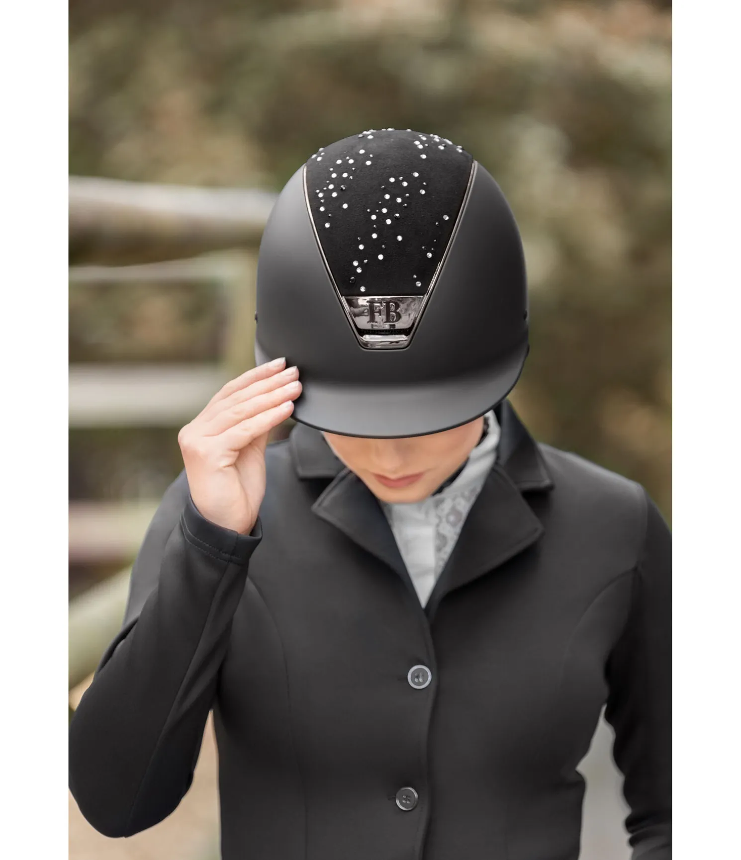 Casque d’équitation Felix Bühler haut de gamme avec décor de strass tel un ciel étoilé. Pour garantir un niveau de sécurité maximal, ce casque est doté de la technologie Hardshell avec une coque extérieure résistante aux chocs. Les ouvertures à l’avant assurent une aération optimale sur l’ensemble de la tête grâce à des canaux de ventilation internes passant de l’avant à l’arrière du casque. La doublure intérieure absorbant l’humidité est amovible et lavable à 30°C. Le casque dispose d’une fermeture magnétique innovante pour une ouverture à une seule main, facile et rapide. Grâce à la fonction Easy-Lock/No-Unlock, l’aimant verrouille l’attache dès que la boucle est approchée du fermoir. L’ouverture accidentelle du fermoir en tirant ou en tournant la boucle est impossible. Celle-ci peut être déverrouillé uniquement en appuyant fermement sur le bouton Unlock situé sur le côté. La molette à l’arrière du casque offre un ajustement précis et individuel, au millimètre près, à la circonférence de la tête. Les sangles recouvertes soulignent le design raffiné du casque et disposent de coussinets au niveau de la nuque et du menton pour garantir un confort de port optimal au cavalier. Ce casque d’équitation est certifié selon la norme EN1384:2023.