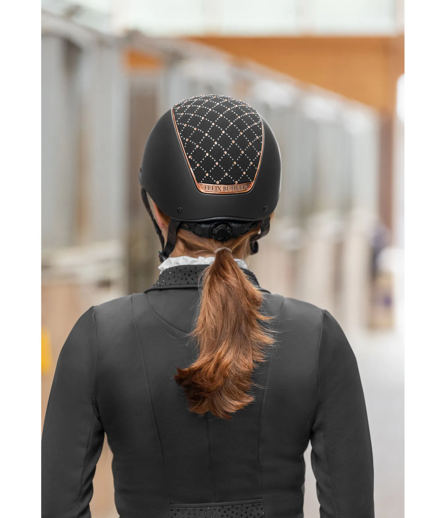 Casque d’équitation Felix Bühler haut de gamme avec décor de strass disposés en losanges. Pour garantir un niveau de sécurité maximal, ce casque est doté de la technologie Hardshell avec une coque extérieure résistante aux chocs. Les ouvertures à l’avant assurent une aération optimale sur l’ensemble de la tête grâce à des canaux de ventilation internes passant de l’avant à l’arrière du casque. La doublure intérieure absorbant l’humidité est amovible et lavable à 30°C. Le casque dispose d’une fermeture magnétique innovante pour une ouverture à une seule main, facile et rapide. Grâce à la fonction Easy-Lock/No-Unlock, l’aimant verrouille l’attache dès que la boucle est approchée du fermoir. L’ouverture accidentelle du fermoir en tirant ou en tournant la boucle est impossible. Celle-ci peut être déverrouillé uniquement en appuyant fermement sur le bouton Unlock situé sur le côté. La molette à l’arrière du casque offre un ajustement précis et individuel, au millimètre près, à la circonférence de la tête. Les sangles recouvertes soulignent le design raffiné du casque et disposent de coussinets au niveau de la nuque et du menton pour garantir un confort de port optimal au cavalier. Ce casque d’équitation est certifié selon la norme EN1384:2023.