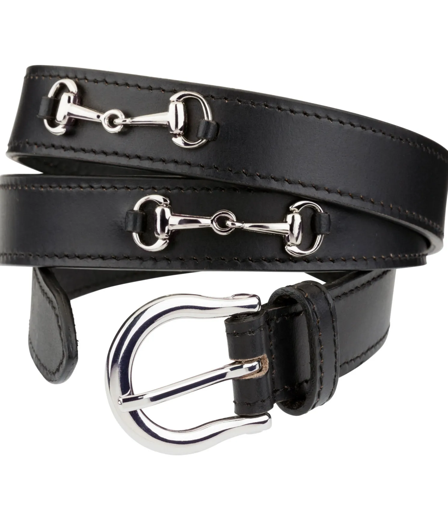 Élégante ceinture en cuir véritable. Motifs de petit mors sur toute la longueur. Coloris noir et marron avec boucle et mors argentés et coloris navy avec boucle et mors rose doré. Largeur 2,5 cm.