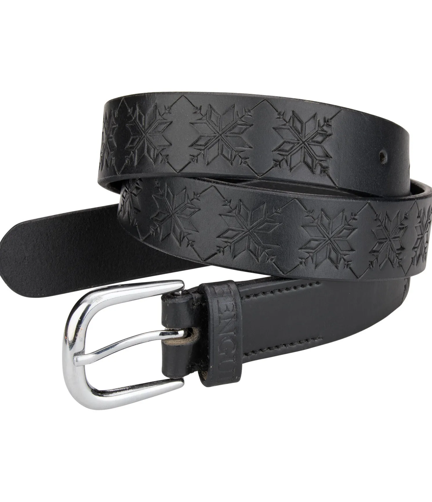 Ceinture tendance en cuir véritable avec motif norvégien all-over en relief. Boucle argentée.