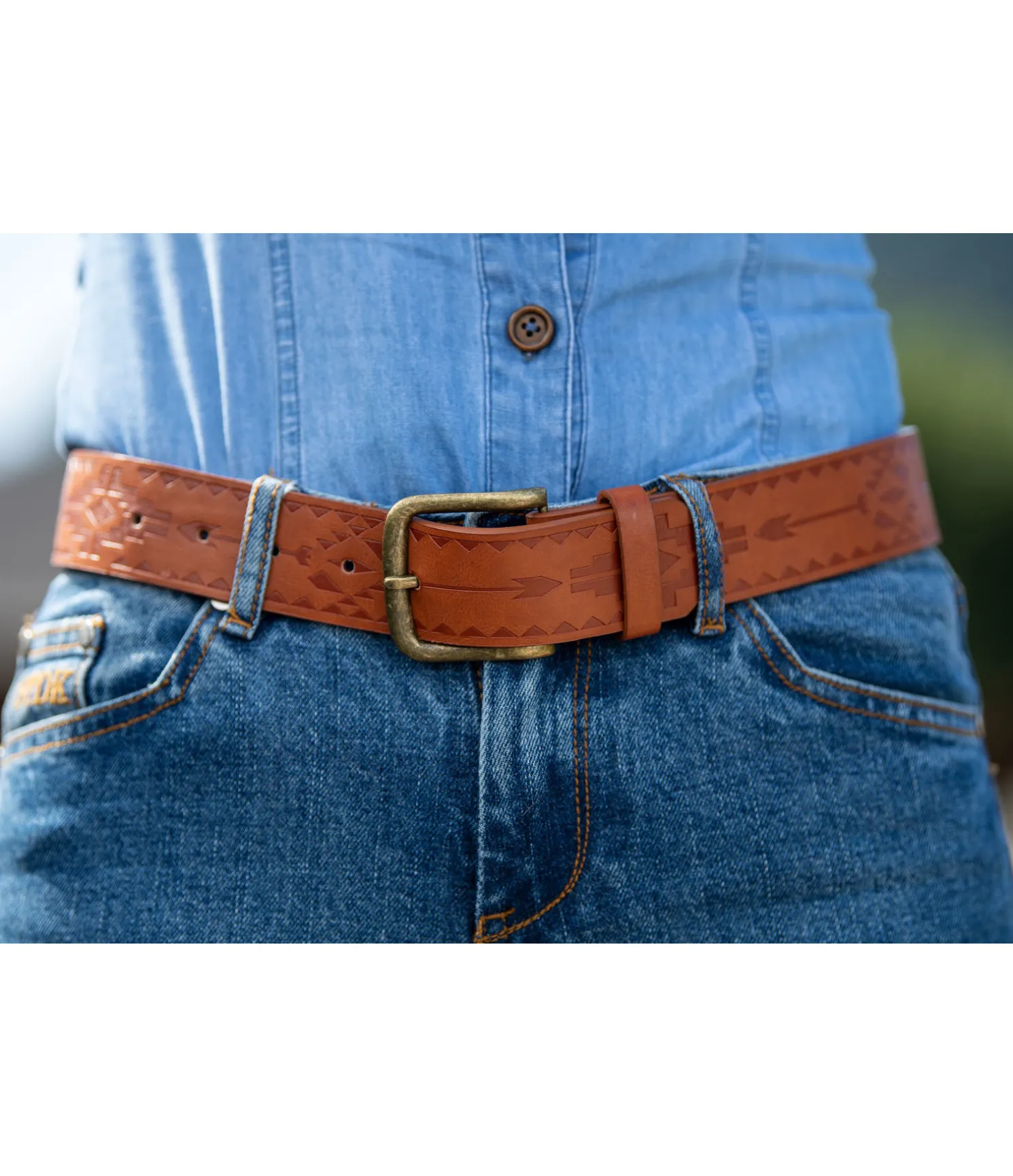 Ceinture chic avec un imprimé aztèque estampé moderne. Boucle interchangeable. Synthétique. Largeur 3,5 cm.