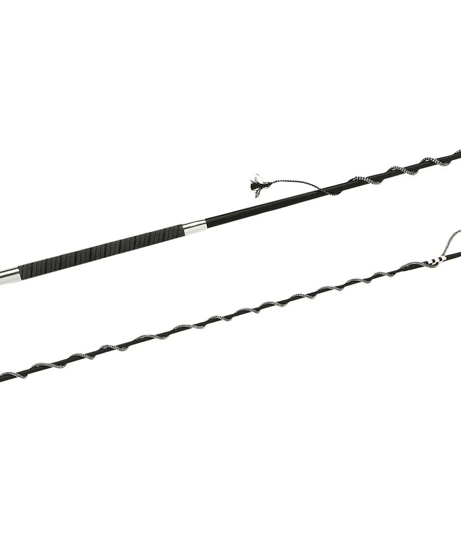 En fibre de verre recouverte de nylon tressé. Avec poignée antidérapante et longue flotte en nylon.