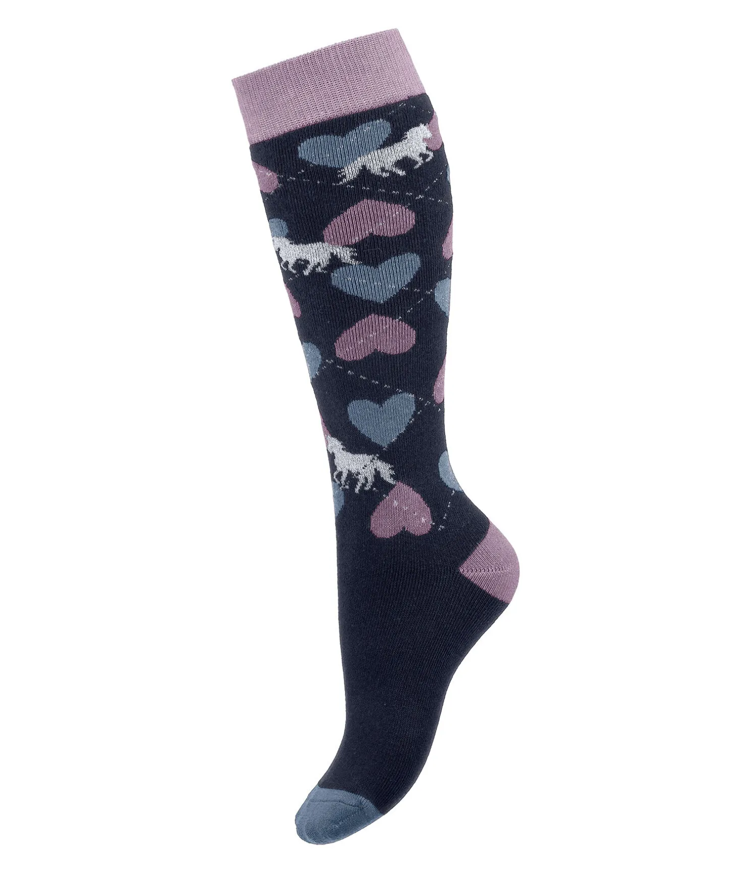 Chaussettes hautes pour enfant avec adorable imprimé all-over motifs cheval, coeur et argyle. 80 % coton, 17 % polyester, 2 % nylon, 1 % élasthanne.