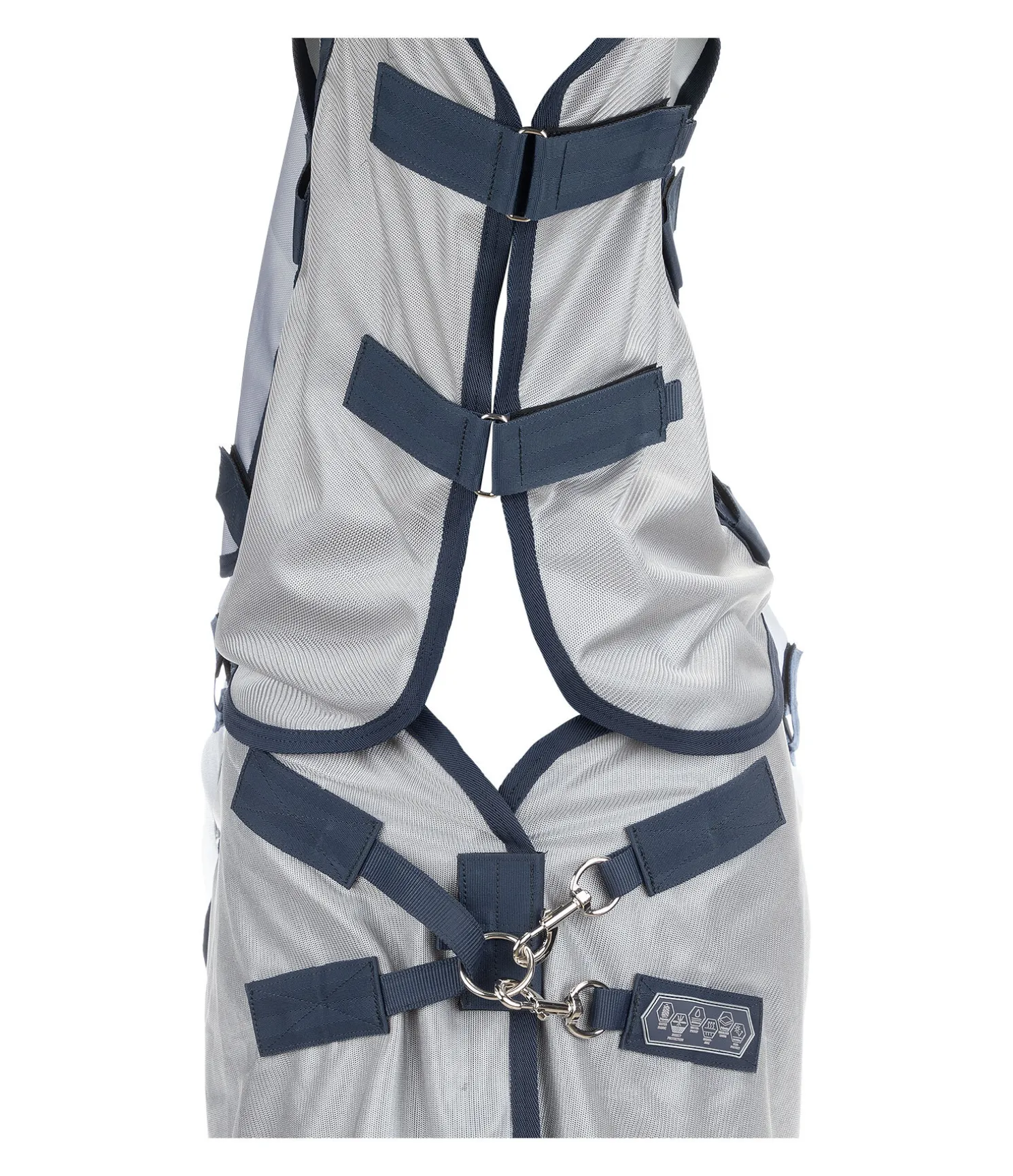 La chemise anti-mouches est conçue dans une matière fine en maille serrée empêchant même les plus petits insectes de passer et bloquant efficacement au moins 70 % des rayons UV. En ajoutant l’empiècement imperméable, la protection UV est encore meilleure pour le dos du cheval (jusqu’à 90 % des rayons UV sont bloqués). Avec couvre-cou amovible doté d’une patte auto-agrippante élastiquée pour la fixation au licol. Fermeture de poitrail équilibrée en deux points avec 2 mousquetons. Rabat ventral réglable avec trois sangles réglables à crochet en T et large rabat de queue. Coupe longue au niveau des membres pour une protection maximale contre les insectes. Plis d’aisance aux épaules pour une liberté de mouvement optimale. Courroie de queue réglable. Doublure lisse protégeant la robe au niveau des épaules et de la crinière pour éviter la casse des crins. 100 % polyester.