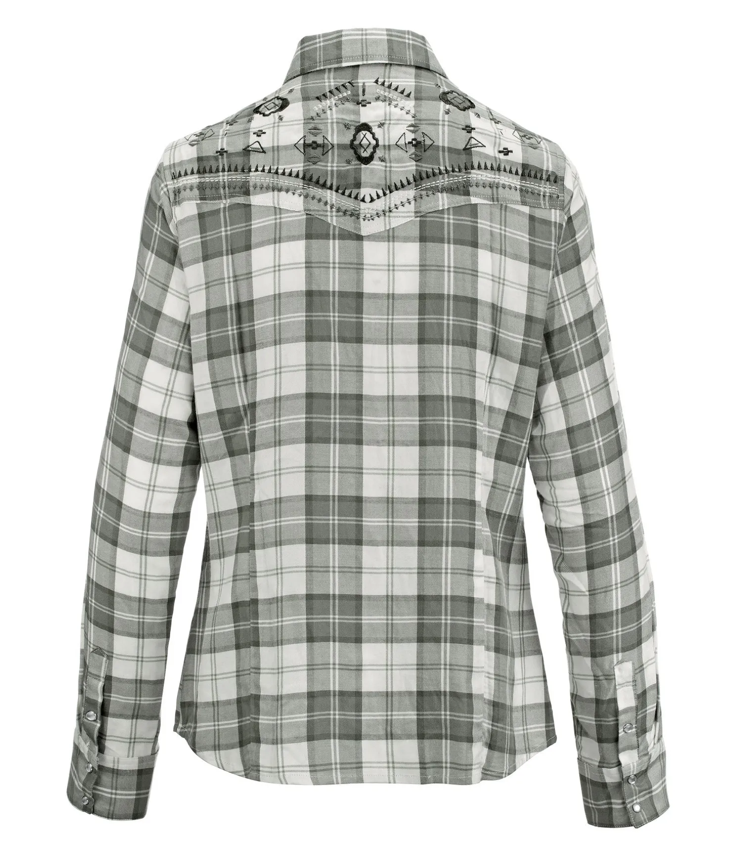 Chemise à carreaux. Coupe droite. Deux poches plaquées sur la poitrine. Patte de boutonnage et bas des manches avec boutons-pression nacrés. Yoke western brodé avec motif aztèque. Matière respirante. 100 % viscose.