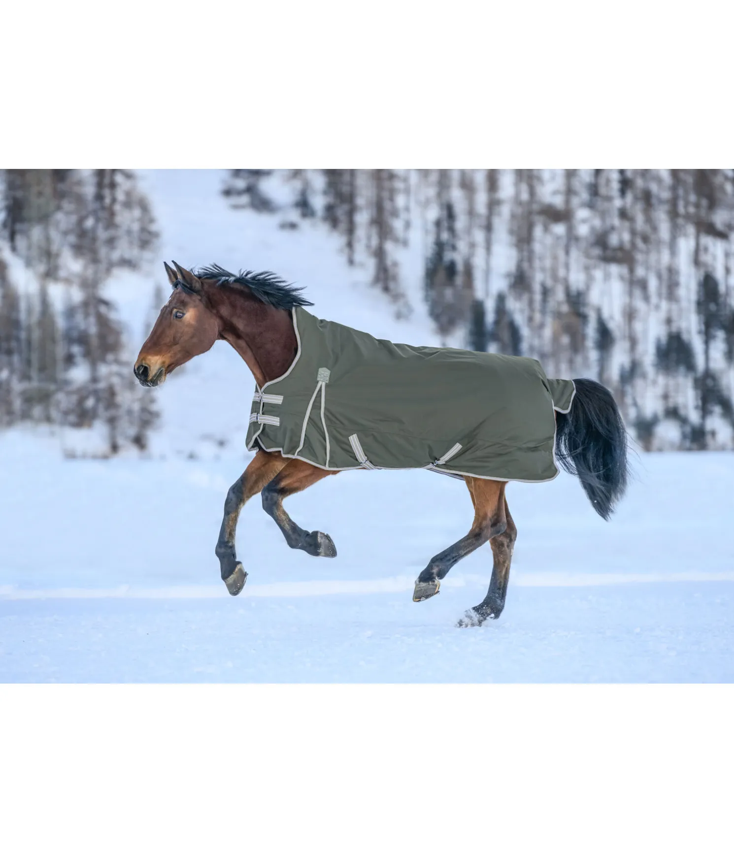 Chemise d’extérieur Highneck technique. Matière Ripstop (600 deniers) et imperméable (3.000 mm). La coupe Highneck permet d’éviter les pressions au niveau du garrot et empêche l’infiltration d’eau au niveau des épaules pour une protection efficace en cas de forte averse. Plis d’aisance pour une liberté de mouvement optimale. Double fermeture de poitrail avec crochets en T et patte auto-agrippante supplémentaire. Sursangles croisées réglables et rabat de queue. Anneaux permettant la fixation de courroies de cuisses (non incluses). Courroie de queue réglable incluse. Doublure lisse protégeant la robe. 100 % polyester.