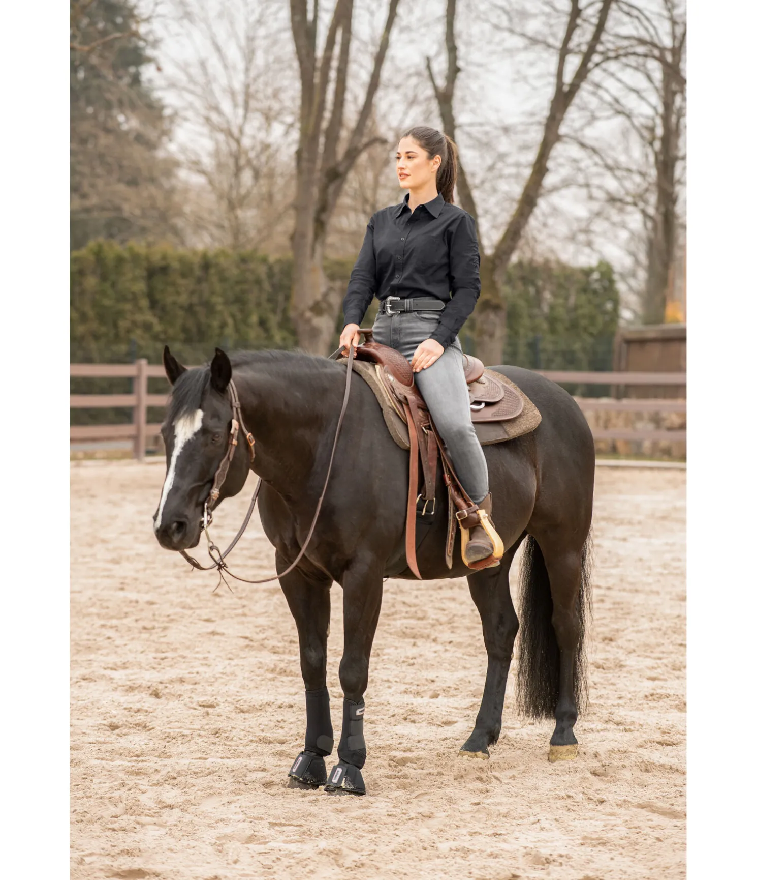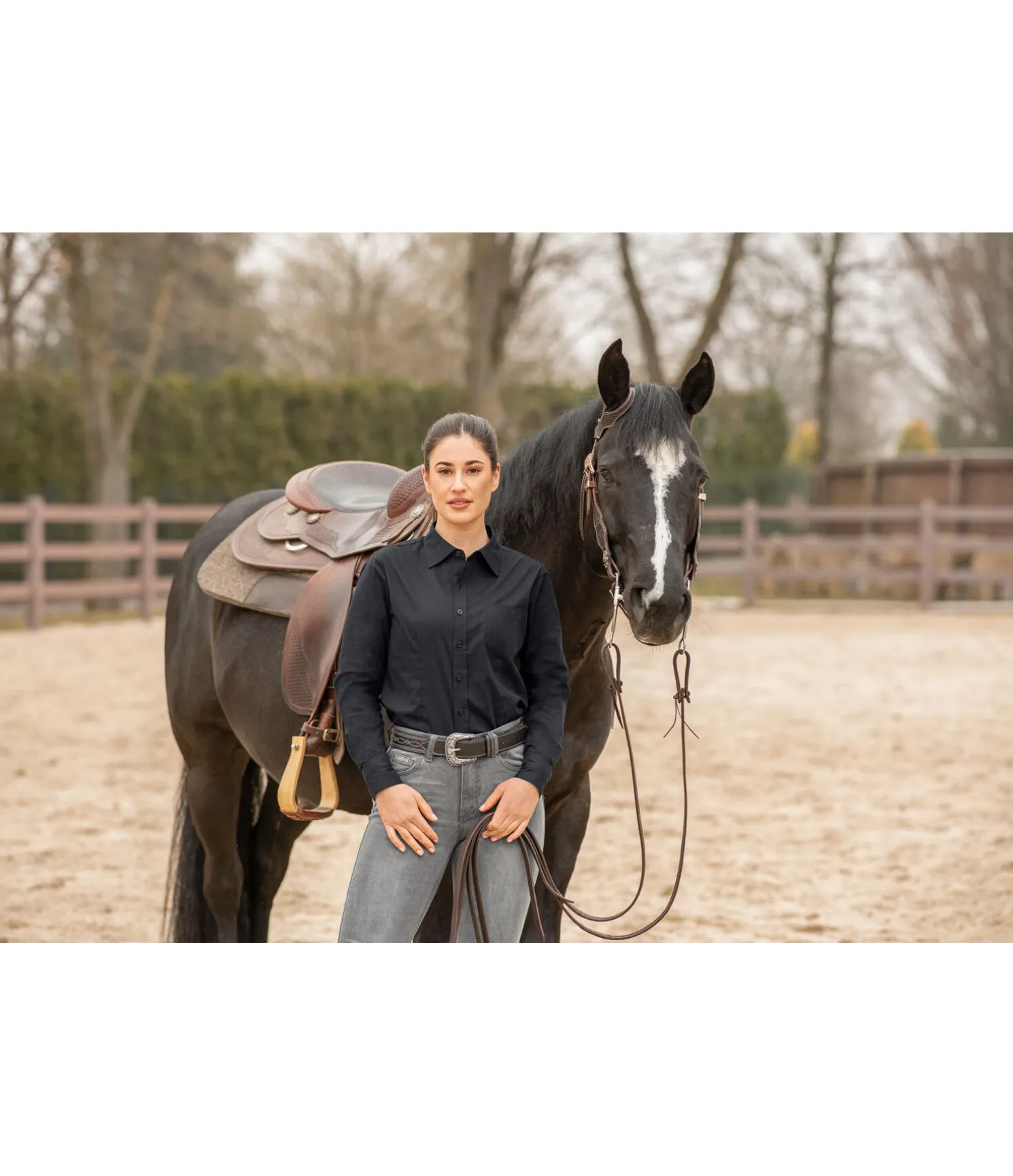 Chemise confortable et sportswear pour femme à porter au quotidien ou en concours. Avec broderie logo discrète sur la manche et la poche de poitrine. Respirante. 97 % coton, 3 % élasthanne.