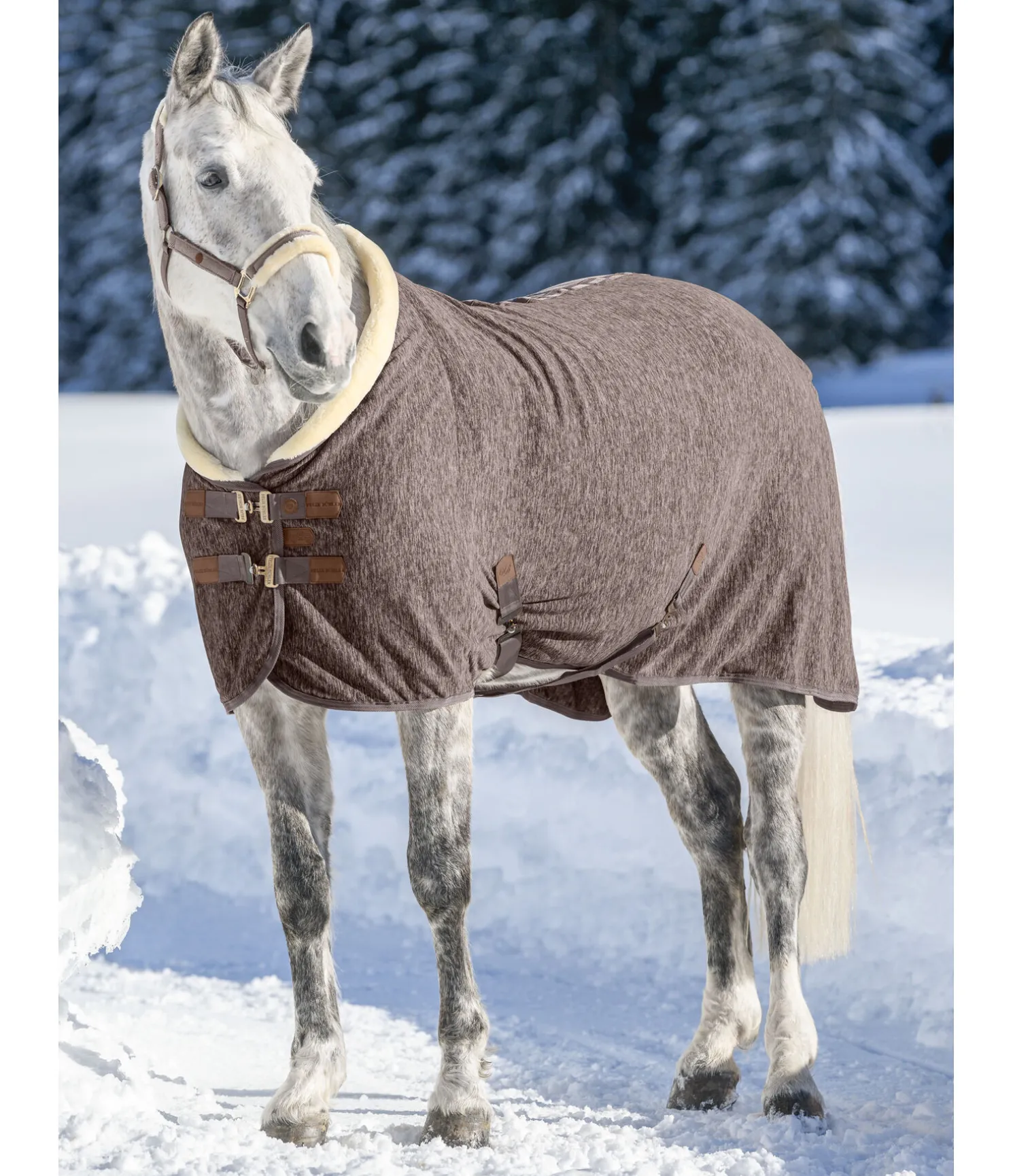 Chemise séchante en tricot polaire chiné avec col en polaire Teddy douce. Assortie à la collection Felix Bühler Knitted. Garde le cheval bien au chaud avant et après le travail et favorise l’évacuation de la transpiration et de l’humidité. Logo en velours synthétique embossé. Double fermeture de poitrail avec crochets en T et patte auto-agrippante supplémentaire, doublure intérieure lisse protégeant la robe au niveau des épaules. Équipée de sursangles croisées et d’une courroie de queue réglables. 100 % polyester.