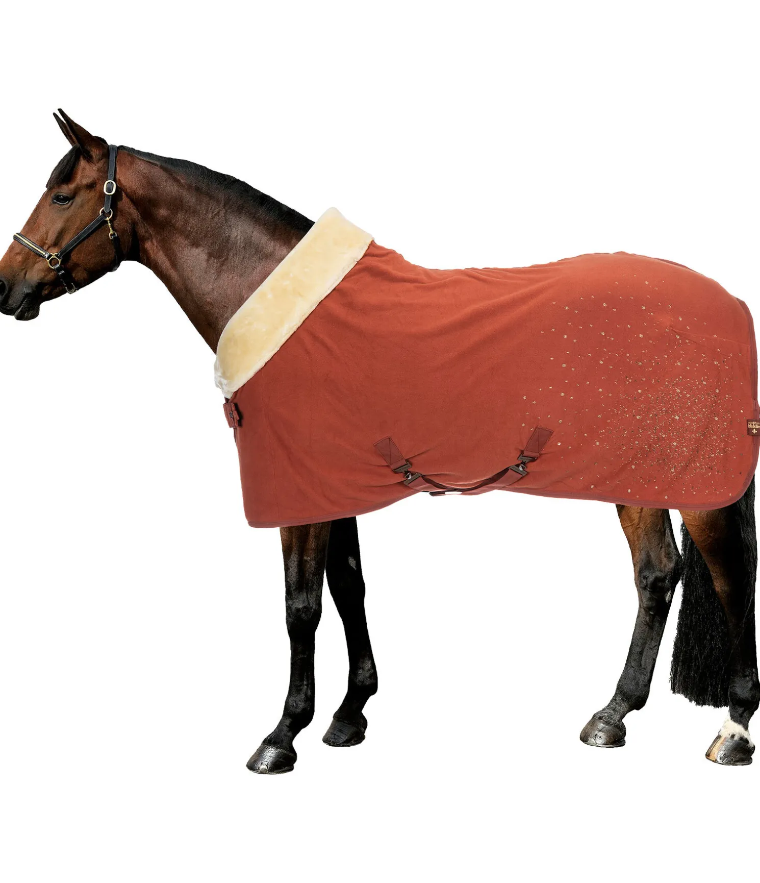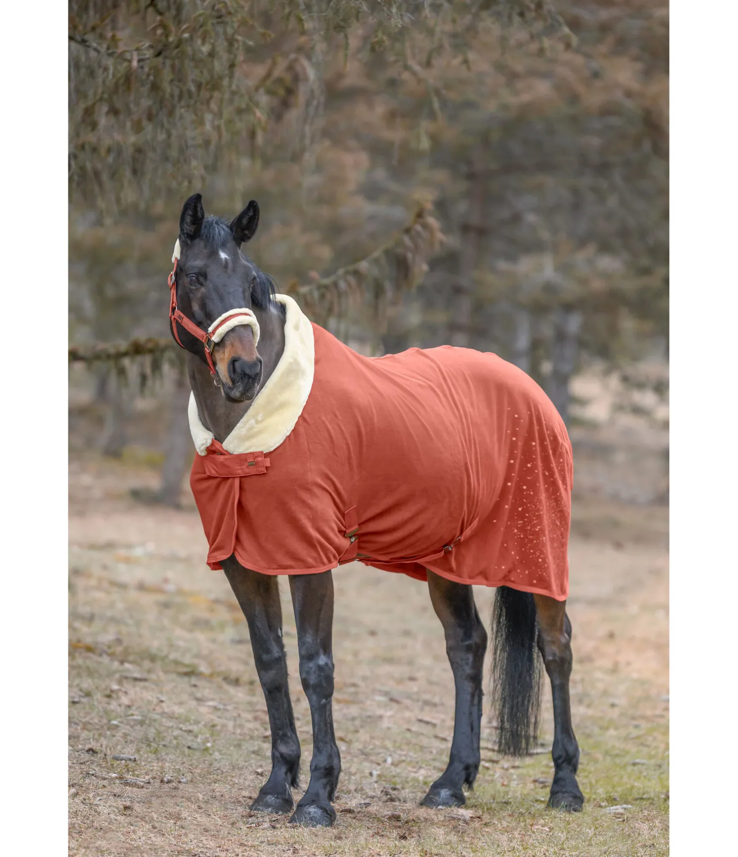 Chemise séchante chaude et douce avec col rembourré en polaire Teddy. Joli imprimé scintillant sur la partie arrière gauche de la couverture. Doublure lisse protégeant la robe au niveau des épaules et du poitrail, pour éviter les irritations dues aux frottements. Sursangles croisées amovibles de chaque côté. Fermeture de poitrail dissimulée avec crochet en T. Courroie de queue réglable incluse. Bouclerie argentée pour la couleur S et GA et rose doré pour la couleur NV. 100 % polyester.