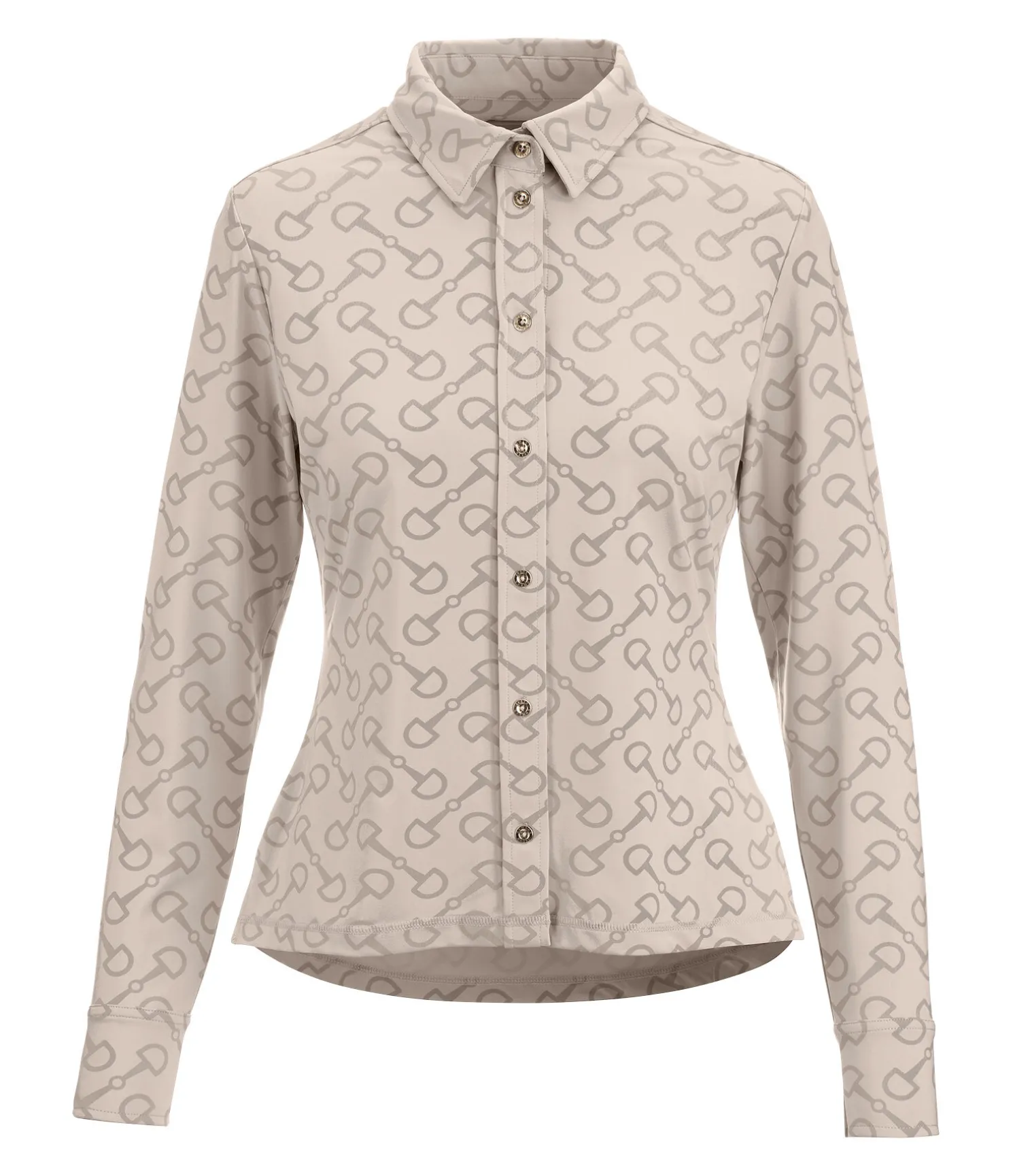 Élégante chemise extensible en matière technique respirante et à séchage rapide avec imprimé all-over à motif mors. Patte de boutonnage et boutons en bas des manches. 85 % polyester, 15 % élasthanne.