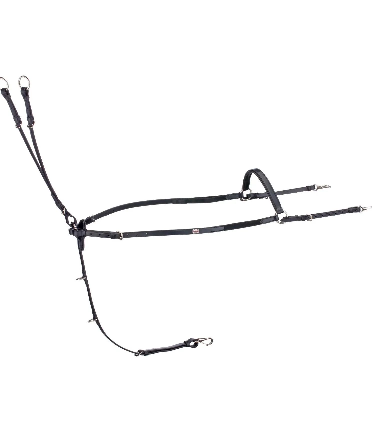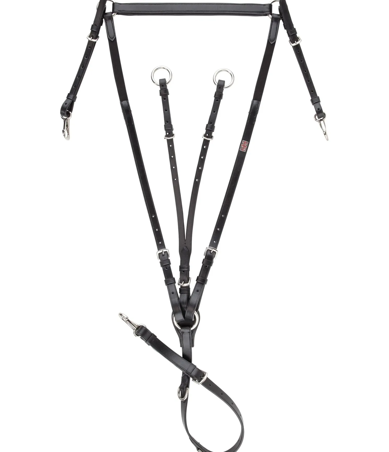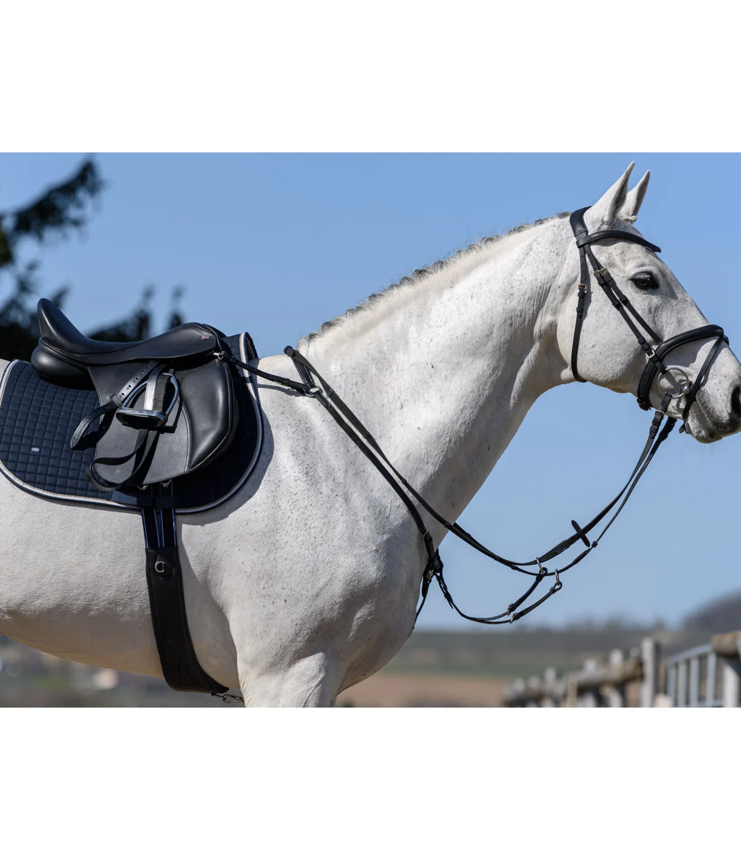 Collier de chasse réglable, qui empêche la selle de glisser vers l’arrière tout en offrant une liberté de mouvement optimale grâce aux élastiques des deux côtés. Fixation simple à la selle et à la sangle grâce à des mousquetons pratiques. Poitrail et garrot doublés en cuir doux. Avec martingale réglable, amovible et boucles en D supplémentaires. Bouclerie argentée.