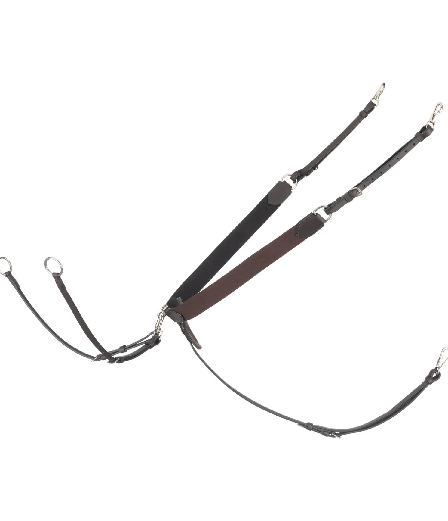 Collier de chasse fonctionnel en cuir gras. Longs empiècements élastiques des deux côtés et point de poitrine sur le poitrail avec doublure douce pour une meilleure répartition des pressions. Empêche la selle de glisser vers l’arrière sans gêner les mouvements du cheval. 3 points d’attache avec mousquetons pour une mise en place facile et rapide. Utilisable dans plusieurs disciplines grâce aux nombreux réglages possibles. Fourche de martingale amovible. Bouclerie argentée.