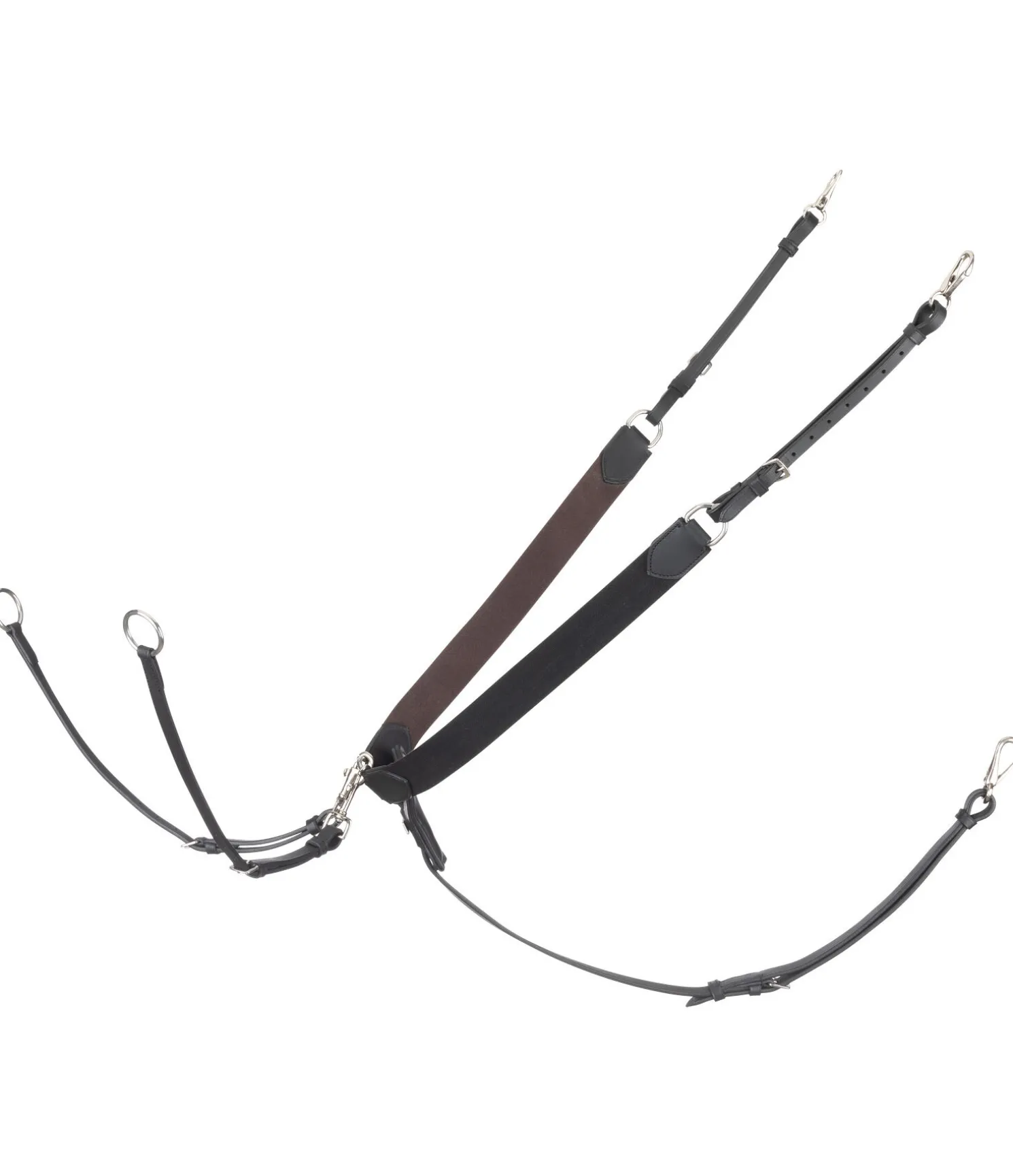 Collier de chasse fonctionnel en cuir gras. Longs empiècements élastiques des deux côtés et point de poitrine sur le poitrail avec doublure douce pour une meilleure répartition des pressions. Empêche la selle de glisser vers l’arrière sans gêner les mouvements du cheval. 3 points d’attache avec mousquetons pour une mise en place facile et rapide. Utilisable dans plusieurs disciplines grâce aux nombreux réglages possibles. Fourche de martingale amovible. Bouclerie argentée.