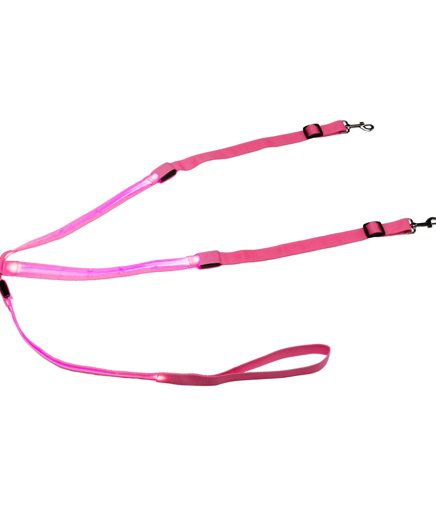 Collier de chasse lumineux fonctionnel avec boucle pour le fixer à la sangle et 2 mousquetons pour le fixer à la selle. 3 fonctions lumineuses différentes sur les 3 bandes concernées. Réglable de double-poney à cheval. Rechargeable par USB.