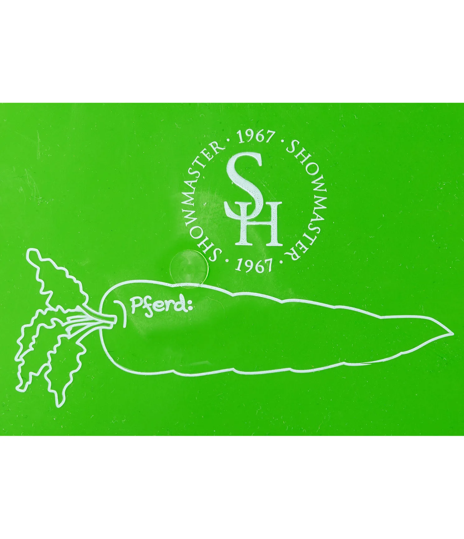 Couvercle pour le seau à carottes Pippa. Avec logo Showmaster et un joli motif de carottes pour y inscrire le nom de ton cheval.