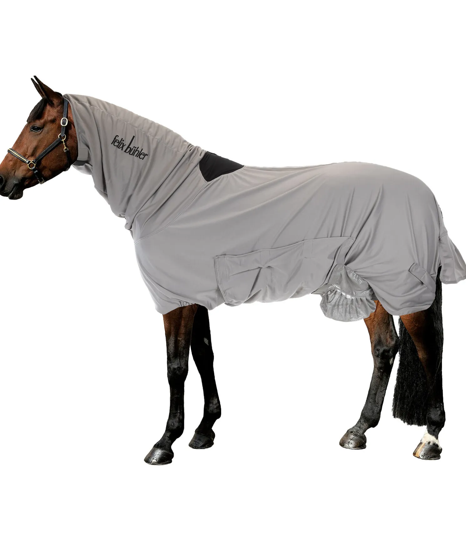 Couverture anti-eczéma innovante et bien ajustée. Tissu technique extensible et respirant bloquant au moins 97 % des rayons UV pour une protection efficace contre le soleil (UPF 50+). Idéale pour les chevaux particulièrement sensibles aux mouches et moustiques. Le couvre-cou et la couverture forment une seule et même pièce afin de ne laisser aucune chance aux insectes. Passant avec patte auto-agrippante sur la partie supérieure de l’encolure pour la fixation au licol. Empiècement léger et particulièrement élastique au garrot pour minimiser les pressions. Offre une protection intégrale grâce au large rabat ventral extensible et au généreux rabat de queue doublé. Pour une bonne protection contre les mouches noires, la couverture dispose d’une protection amovible des parties génitales et des mamelles en tissu en filet respirant qui laisse passer l’urine. 100 % polyester. Notre conseil : pour une protection intégrale, pensez aux masque anti-eczéma Felix Bühler Gibson II (référence 414 242).