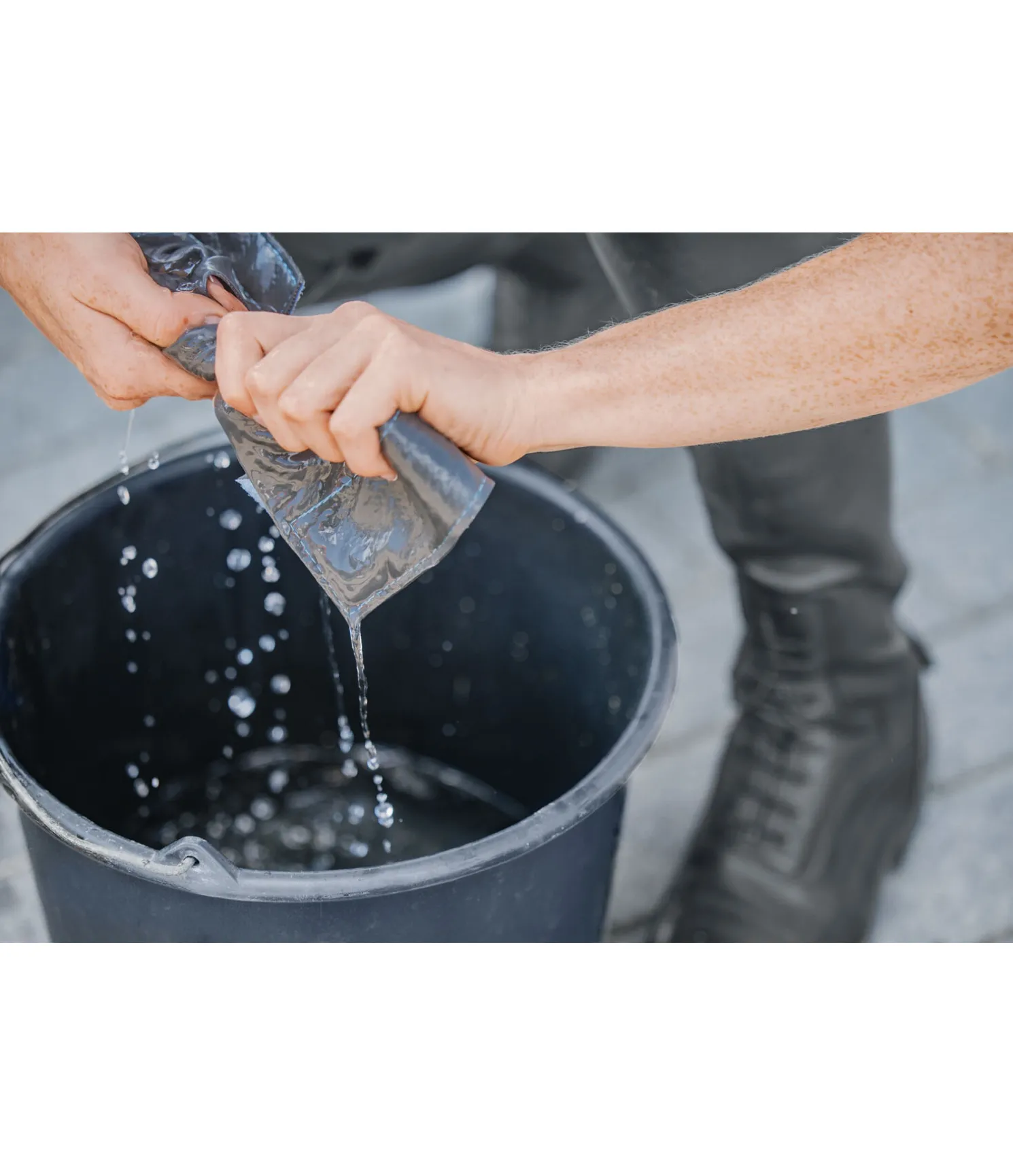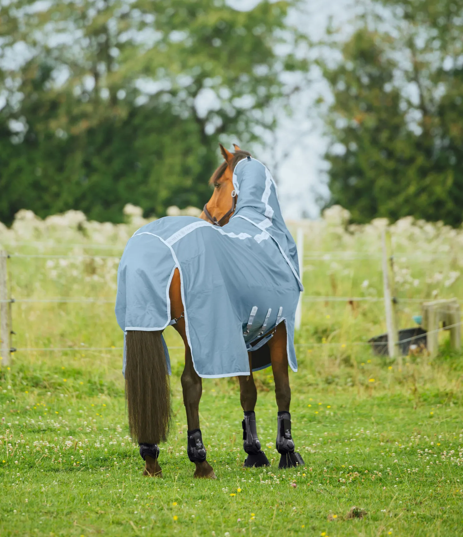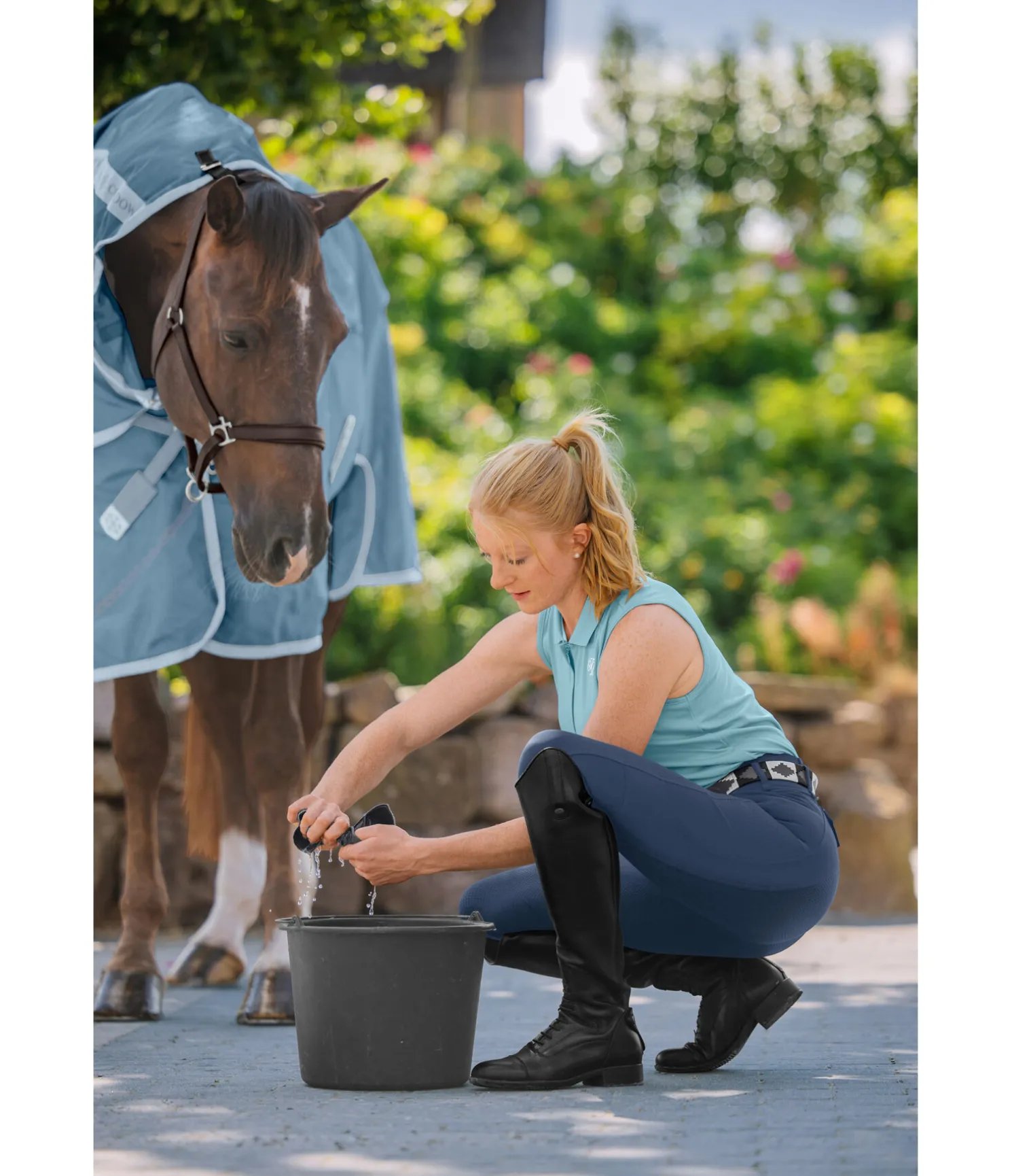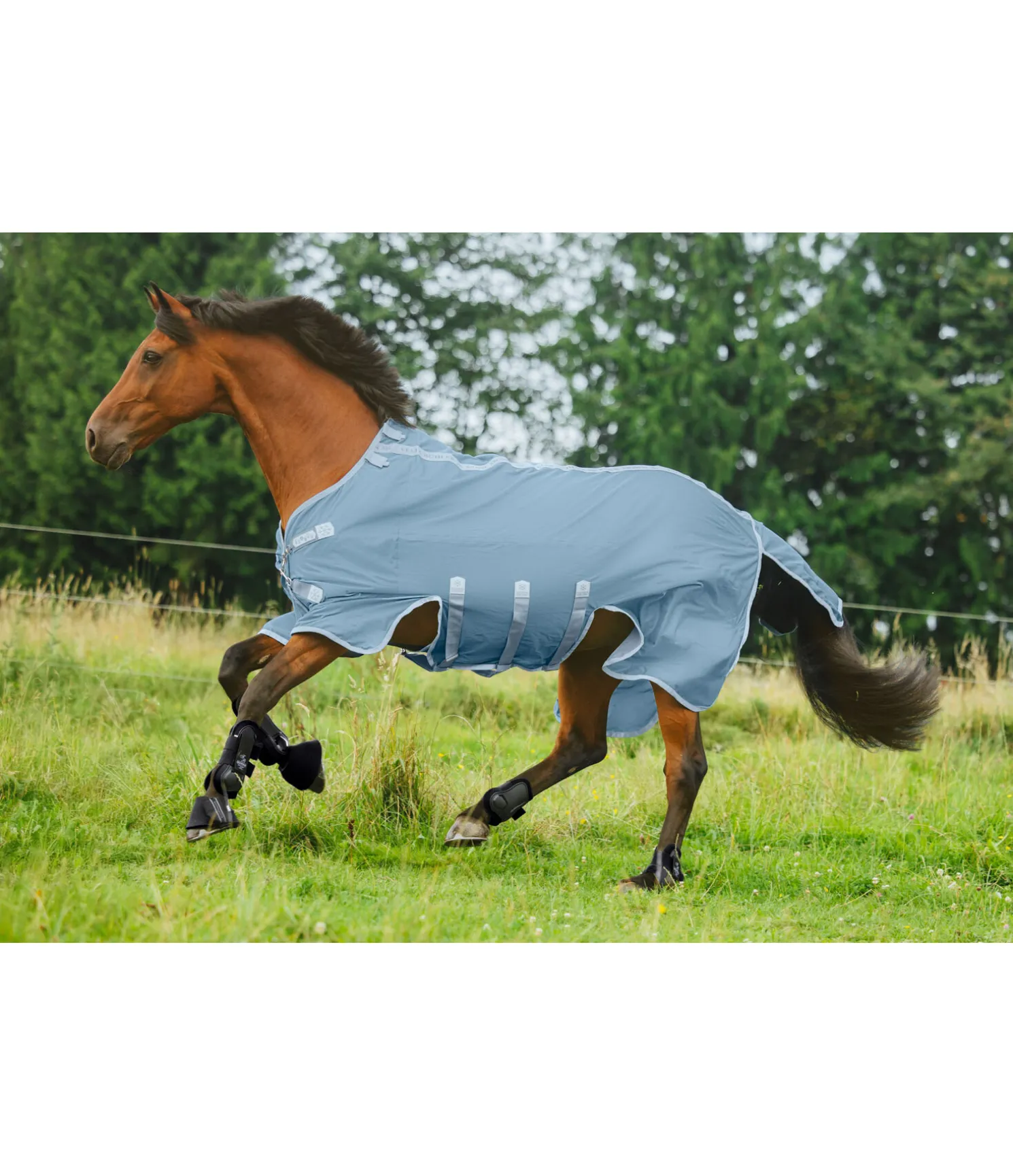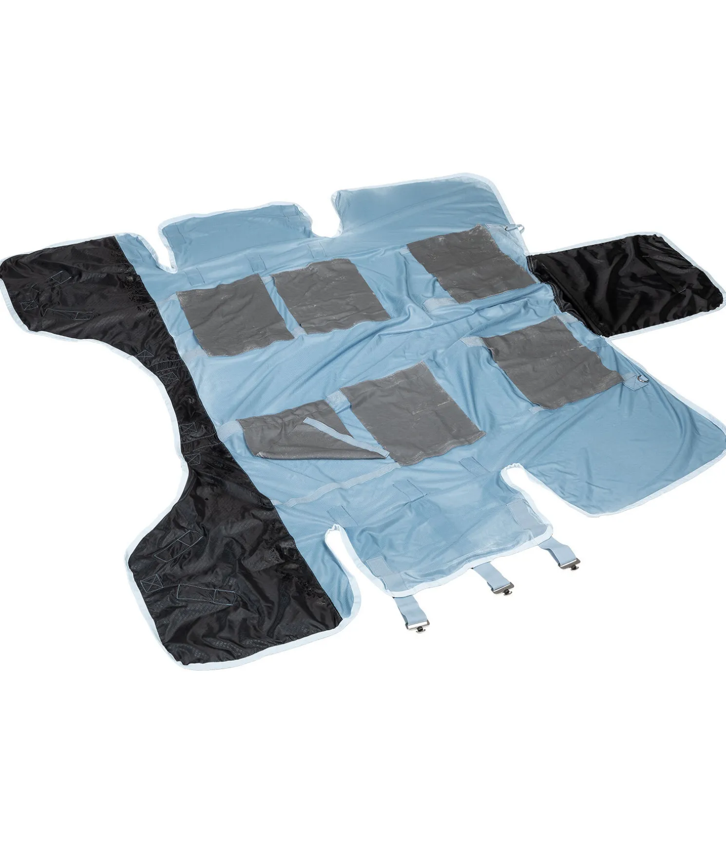 Couverture anti-mouches ajustée 2-en-1 avec coupe bien pensée, côtés rallongés, rabat ventral de protection et couvre-cou amovible pour protéger des insectes gênants. La fermeture en V avec mousquetons et patte auto-agrippante supplémentaire au poitrail maintient efficacement la couverture en place. Le couvre-cou amovible peut être fixé au licol au niveau de la nuque grâce à une boucle élastique réglable. Au niveau des épaules, le long de la crinière et au niveau de la queue, la couverture est de plus doublée d’un tissu brillant qui protège la robe. Lors des journées les plus chaudes, il est possible de placer des pads rafraîchissants afin de rafraîchir légèrement le cheval. Pour cela, les inserts fixés par pattes auto-agrippantes sont placés dans l’eau jusqu’à être entièrement imprégnés. Essorer légèrement puis placer dans la couverture au niveau de la nuque et le long des côtes et fixer à l’aide des pattes auto-agrippantes. L’effet rafraîchissant se fait pleinement sentir après 20 à 30 minutes et les pads devraient seulement alors être placés dans la couverture. Malgré l’utilisation d’eau, les pads rafraichissent sans donner une impression d’humidité. L’échancrure au niveau des reins et le long de la ligne du dos permet de ménager la musculature sensible du cheval et donc d’éviter maladies ou tensions. L’effet rafraîchissant dure tout le temps que l’insert est humide. La durée peut varier selon la température extérieure et le rayonnement du soleil. Les pads rafraîchissants deviennent rigides une fois secs et ne doivent être utilisés que lorsqu’ils sont humides ! Lorsqu’ils sont secs, les pads ne doient être ni tordus, ni pliés ! Peut protéger d’un coup de chaleur. Cette couverture ne peut se substituer à un comportement responsable en été ! Ne mets pas ton cheval au paddock les jours de forte chaleur s’il ne peut se mettre à l’ombre. Les chevaux qui se déplacent beaucoup à l’extérieur sous forte chaleur, voire qui s’ébattent ne peuvent pas être protégés de la surchauffe même avec une couverture rafraîchissante. Nous recommandons d’habituer les seniors ou les chevaux avec des problèmes de circulation du sang progressivement à l’utilisation des pads raftraîchissants. Dans ces cas, l’eau utilisée pour tremper les inserts ne doit pas être trop froide. L’effet rafraîchissant est volontairement léger afin d’éviter les problèmes de circulation sanguine. Avant d’utiliser la couverture avec les inserts rafraîchissants, habituer progressivement votre cheval. La couverture n’est pas destinée à refroidir un cheval échauffé après le travail. Couverture : 100 % polyester ; matériau rafraîchissant : 100 % alcool polyvinylique.