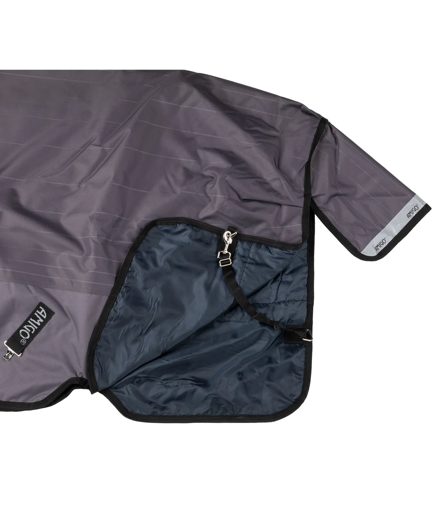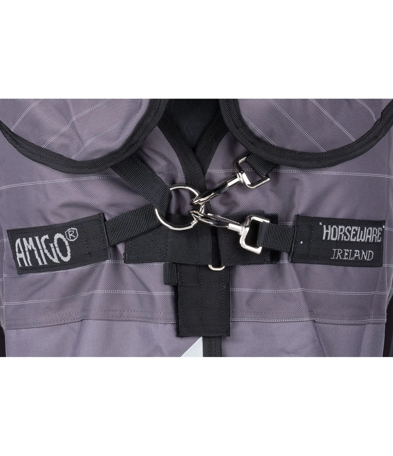 Couverture d’extérieur robuste, résistante à la déchirure, imperméable et respirante (1 200 deniers) avec grammage chaud 100 g. Couvre-cou amovible avec garnissage en fibres polyester. Pour plus de sécurité grâce à une meilleure visibilité dans l’obscurité : passepoil réfléchissant et bandes réfléchissantes sur le poitrail et le rabat de queue. Doublure intérieure lisse en polyester pour éviter la casse des poils. Liberté de mouvement maximale grâce à l’encolure SureFit et son système de fermeture de poitrail en V et aux découpes innovantes au niveau des jambes qui permettent de parfaitement protéger le ventre. Possibilité de fixer des liners (420481 ou 420482) à l’aide d’oeillets pour augmenter le grammage de la couverture et l’adapter ainsi à toutes les conditions météorologiques. Trois sangles croisées pour une meilleure tenue de la couverture. 100% polyester.