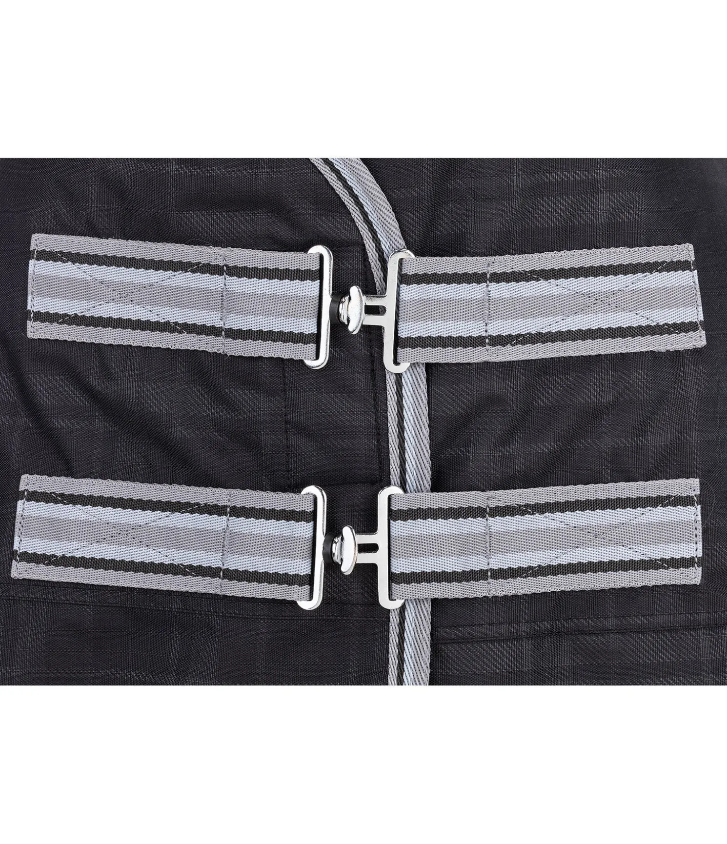 Notre classique existe aussi dans un modèle spécial de couleur noire avec motif à carreaux. Couvre-cou amovible. Couverture d’extérieur imperméable (3.000 mm) et respirante. Matière Ripstop 600 deniers. Protège le cheval du vent, du froid et de la pluie. Peut être utilisée avec ou sans couvre-cou. Plis d’aisance pour une liberté de mouvement optimale, double fermeture de poitrail avec crochets en T et patte auto-agrippante supplémentaire, sursangles croisées réglables et rabat de queue. Sans garnissage. Anneaux permettant la fixation de courroies de cuisses (non incluses), courroie de queue réglable incluse. Doublure intérieure lisse protégeant la robe. 100 % polyester.