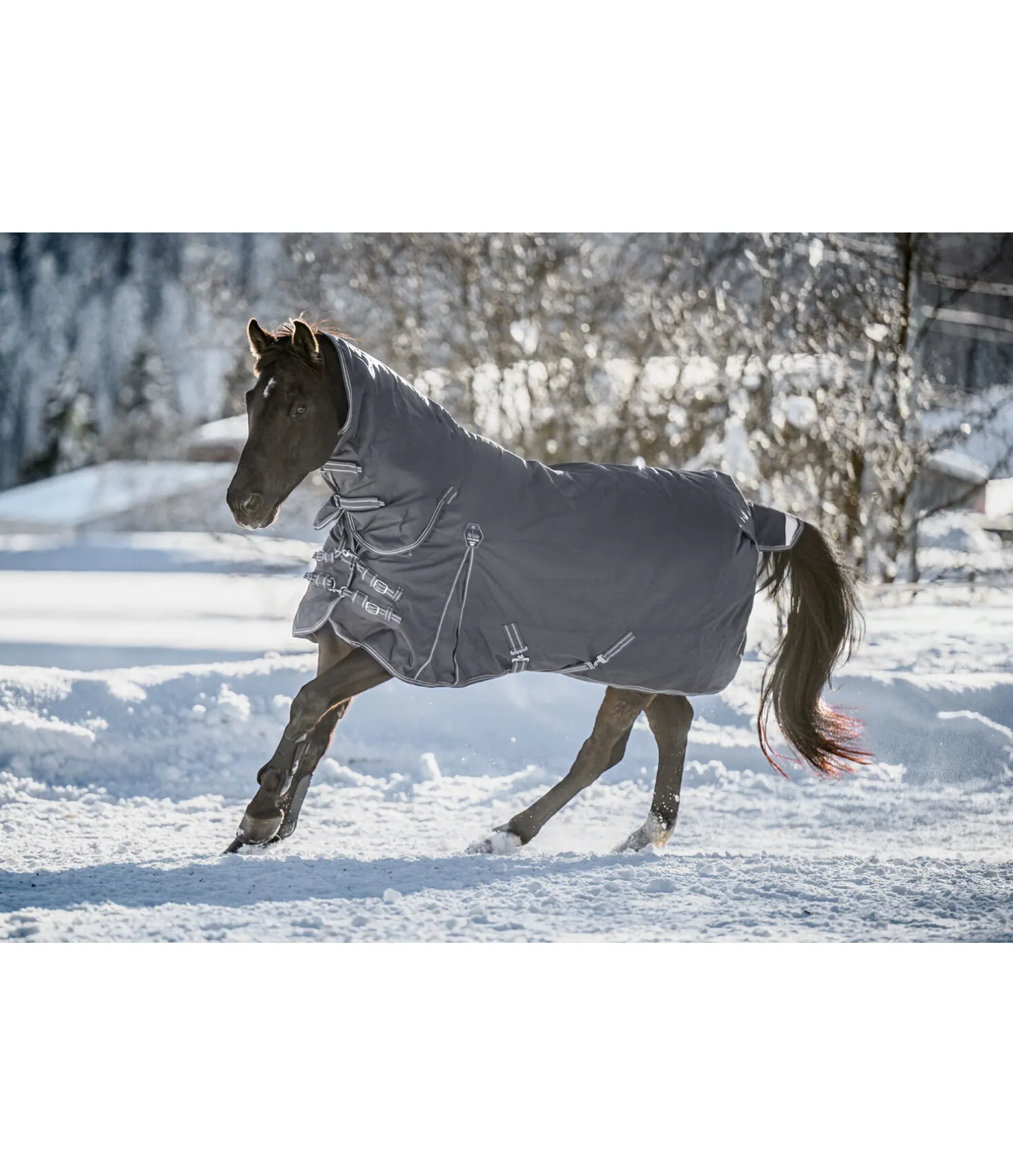 Couverture d’extérieur technique avec couvre-cou, particulièrement polyvalente et résistante à la déchirure. Matière nylon 1 680 deniers, très imperméable (5 000 mm), avec garnissage léger de 50 g et une très bonne respirabilité qui protège efficacement votre cheval contre les intempéries. Le couvre-cou est cousu à la couverture. Comparé au polyester, le nylon est nettement plus doux et soyeux et présente des reflets satinés. De plus, il est beaucoup plus extensible que le polyester ce qui lui donne une meilleure résistance à la déchirure. Les empiècements extensibles et très déperlants en softshell au niveau des épaules et de l’encolure et les grands plis d’aisance permettent une liberté de mouvement optimale et garantissent un ajustement parfait tout en permettant d’éviter les habituels points de pression. Rembourrage généreux pour minimiser davantage les points de pression au niveau du garrot. Fermeture de poitrail réglable équilibrée en 3 points, constituée de 2 mousquetons et de 2 anneaux ainsi que d’une patte auto-agrippante supplémentaire améliorée. Les mousquetons peuvent être facilement remplacés si nécessaire. Doublure lisse protégeant la robe. Sursangles croisées réglables et anneaux permettant la fixation de courroies de cuisses (non incluses). Courroie de queue réglable et rabat de queue avec bandes et passepoil réfléchissants sur le pourtour. Matière extérieure 100 % nylon, doublure 100 % polyester.