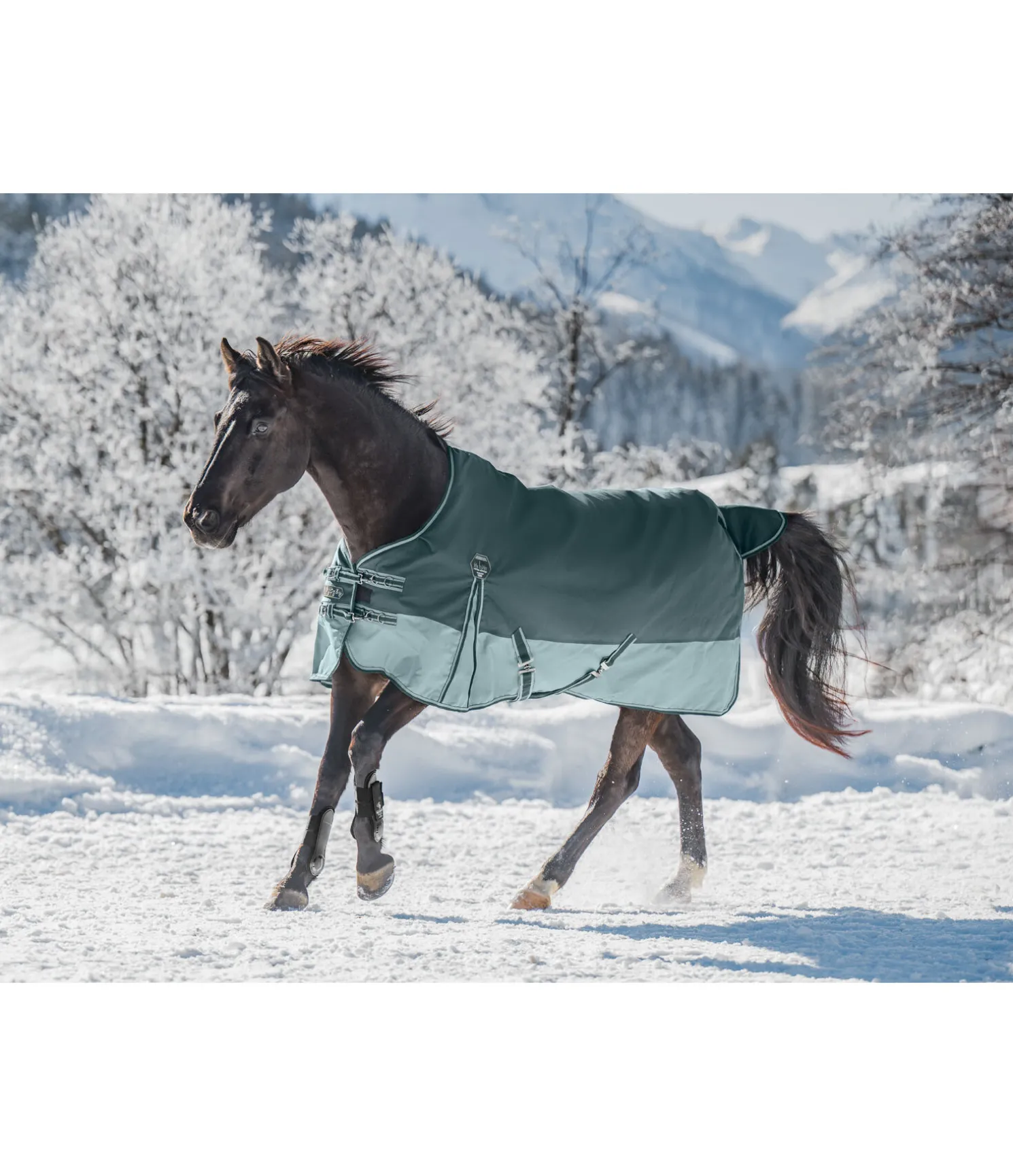 Couverture d’extérieur bicolore résistante et imperméable (3 000 mm) en matière Ripstop solide (1 200 deniers). Coussins au niveau du garrot pour le protéger et éviter les pressions. Garnissage 50 g léger. Doublure lisse protégeant la robe. Double fermeture de poitrail réglable avec mousquetons et patte auto-agrippante supplémentaire pour un maintien sûr. Grands plis d’aisance pour une liberté de mouvement optimale. Sursangles croisées, anneaux permettant de fixer des courroies de cuisses (non incluses) et courroie de queue réglable. 100 % polyester.