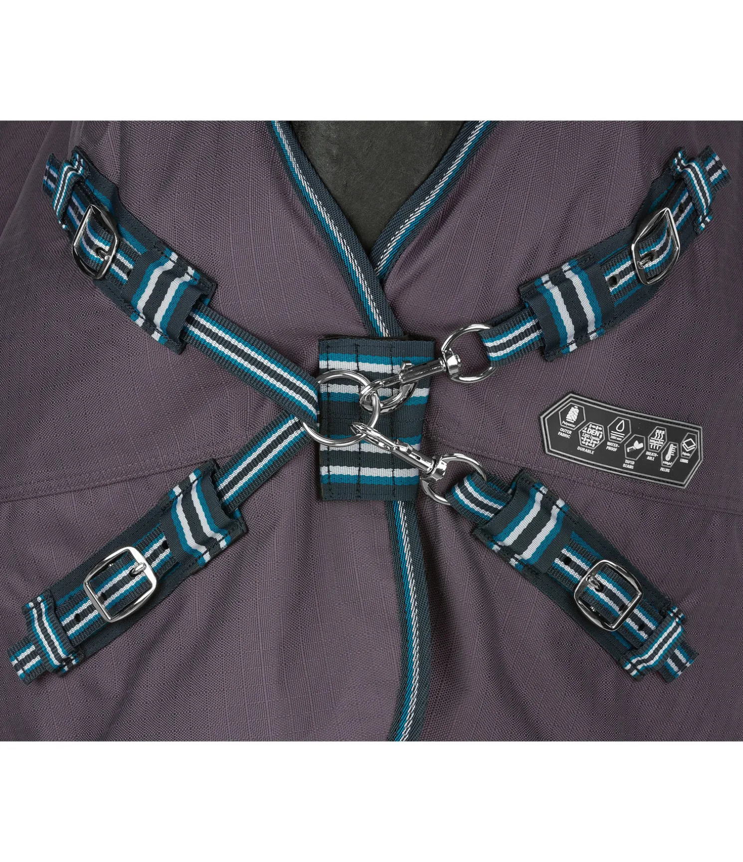 Couverture d’extérieur 4 en 1 avec système de liners innovant, dans une coupe Highneck ! Une couverture – une multitude de possibilités : couverture d’extérieur en matière imperméable (5.000 mm) et particulièrement robuste 1.200 deniers. Livrée avec 2 liners matelassés de 100 g (vert) et 200 g (bleu). La partie imperméable comprend une longue fermeture à glissière dissimulée le long des flancs, qui permet de fixer les différents liners à la couverture avec des pattes auto-agrippantes supplémentaires. Les deux liners peuvent être combinés pour les jours les plus froids afin de former une couverture 300 g. Cette couverture peut ainsi être utilisée en tant que simple chemise imperméable 0 g ou en tant que couverture avec garnissage 100 g, 200 g ou 300 g. Ce système innovant permet d’ajouter des épaisseurs sans embarrasser le cheval avec des fermetures, sursangles ou boucles supplémentaires. Grâce à ce système, cette couverture est également plus pratique et moins encombrante que les couvertures avec liners classiques. La partie extérieure est équipée d’une fermeture de poitrail équilibrée en plusieurs points réglable des deux côtés, avec mousquetons, anneaux et patte auto-agrippante supplémentaire. Rembourrage au niveau de l’encolure pour un confort optimal. Doublure lisse protégeant la robe pour éviter les irritations dues aux frottements. Sursangles croisées réglables, rabat de queue et courroie de queue. Anneaux permettant de fixer des courroies de cuisses (non incluses). 100 % polyester. En raison de ses propriétés innovantes, ce produit est protégé par un modéle d’utilité.