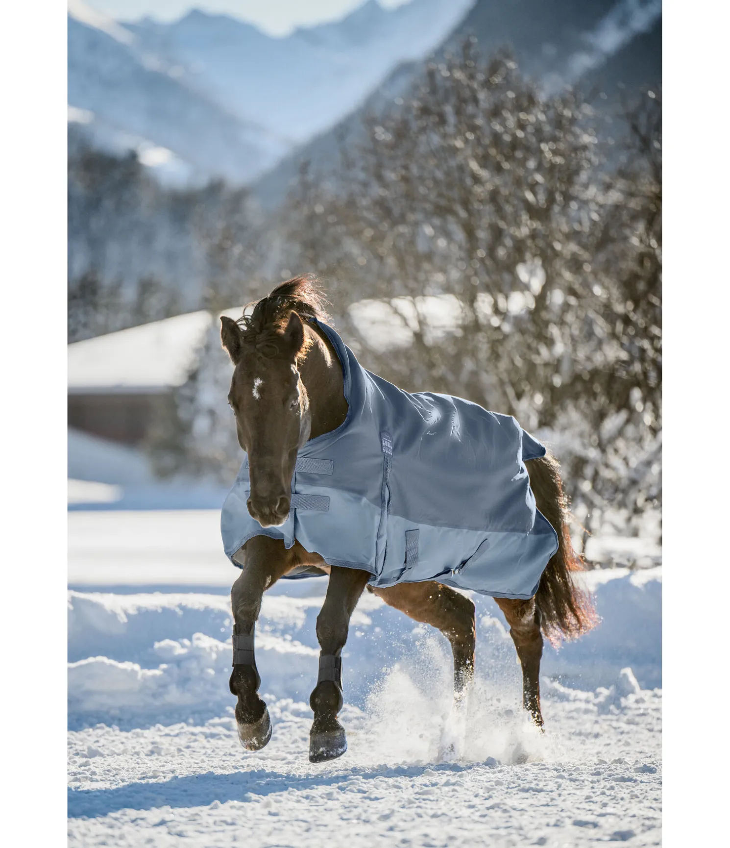 Couverture d’extérieur solide, imperméable (4 000 mm) en matière technique résistante Ripstop 1 000 deniers avec grammage 150 g et coupe Highneck permettant une meilleure répartition des pressions et protégeant le garrot. Grands plis d’aisance pour une liberté de mouvement optimale. Bandes de couleur assortie le long des flancs. Doublure lisse protégeant la robe. Double fermeture de poitrail avec crochets en T, sursangles croisées et courroie de queue réglable. Anneaux permettant de fixer des courroies de cuisses (non incluses). 100 % polyester.