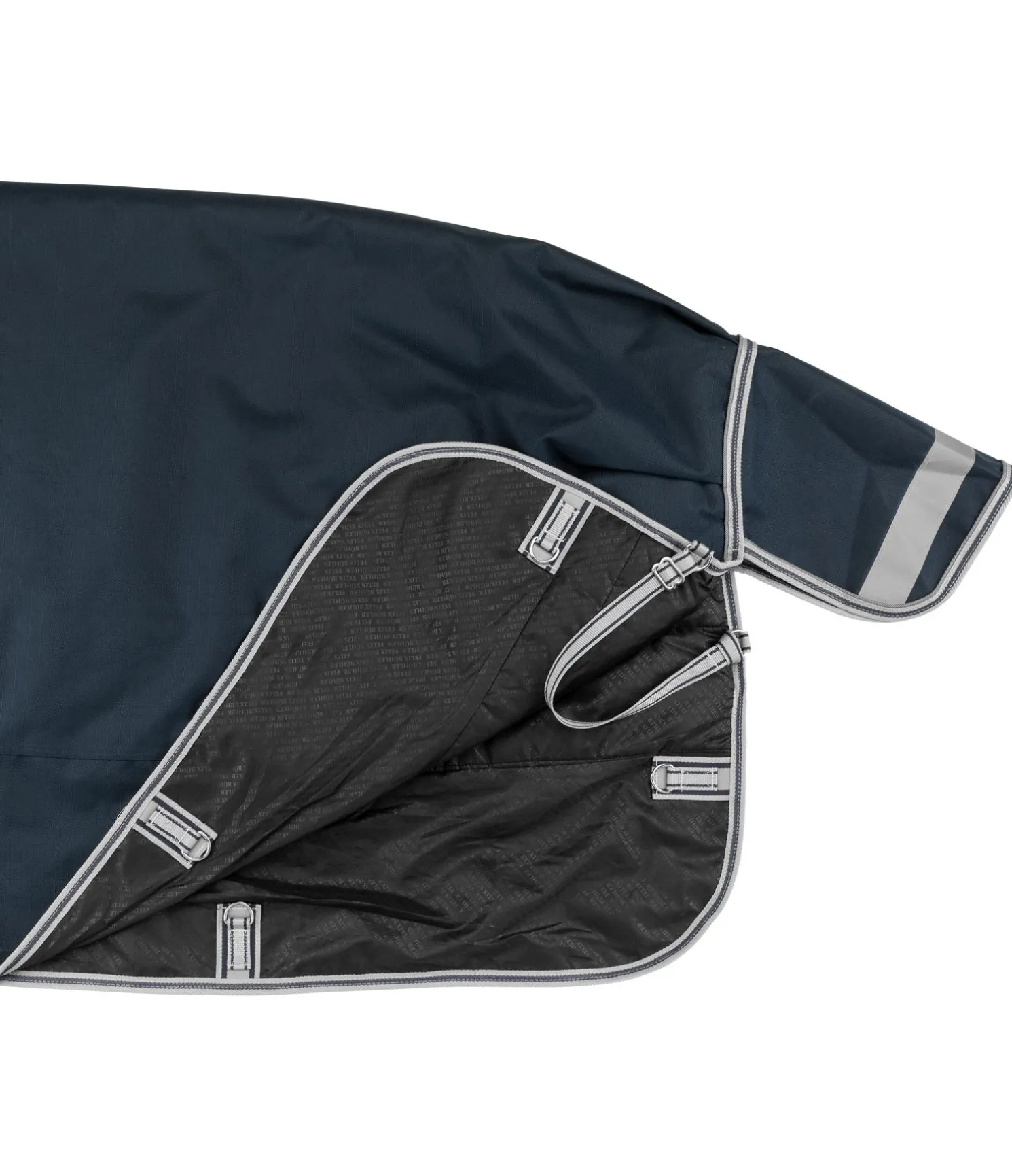 Chemise d’extérieur de grande qualité dans une coupe Highneck protectrice, en matière Ripstop 1.200 deniers particulièrement imperméable (5.000 mm), qui protège efficacement en cas d’averse. Garnissage 350 g chaud. Les nombreux éléments réfléchissants tels que le passepoil en bordure et les bandes sur le poitrail, l’arrière-main et le rabat de queue assurent une bonne visibilité et une sécurité optimale. Double fermeture de poitrail équilibrée en plusieurs points avec patte auto-agrippante supplémentaire, sursangles croisées réglables. Doublure lisse protégeant la robe. Anneaux permettant la fixation de courroies de cuisses (non incluses). Rabat de queue et courroie de queue réglable. 100 % polyester.