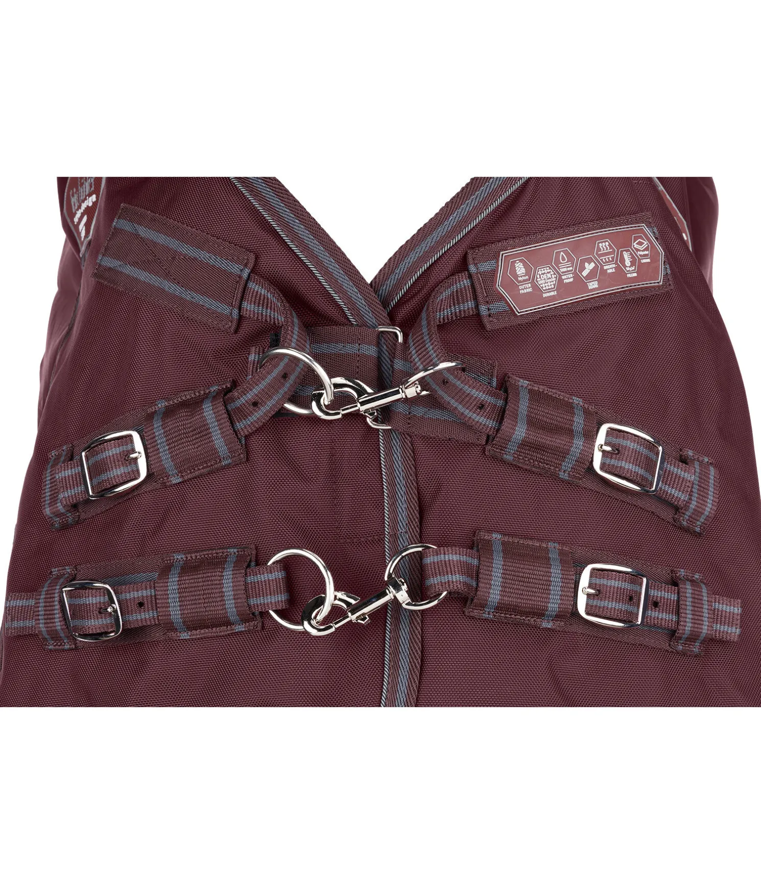 Notre best-seller ! La matière extérieure offre désormais une plus grande résistance à la déchirure et une meilleure imperméabilité pour garantir une longévité optimale avec le même confort qu’auparavant ! Couverture d’extérieur fonctionnelle dans une coupe Highneck. Matière en nylon 1 680 deniers particulièrement résistante. Grande imperméabilité (5.000 mm). Comparé au polyester, le nylon est nettement plus doux et soyeux, avec des reflets satinés. Il est également plus extensible que le polyester pour une meilleure résistance à la déchirure. Garnissage de 200 g. Inserts extensibles déperlants en softshell au niveau des épaules et de l’encolure. Grands plis d’aisance pour une liberté de mouvement optimale afin d’éviter les pressions. Rembourrage intérieur généreux pour minimiser davantage les pressions au niveau du garrot. Fermeture de poitrail réglable équilibrée en 3 points, constituée de 2 anneaux et 2 mousquetons et d’une patte auto-agrippante supplémentaire. Les mousquetons peuvent être facilement remplacés si besoin. Doublure lisse protégeant la robe. Sursangles croisées réglables et anneaux permettant la fixation de courroies de cuisses (non incluses). Courroie de queue et rabat de queue réglables en longueur avec bandes et passepoil réfléchissants sur le pourtour. Peut être parfaitement associée avec l’extension de poitrail assortie, article 422 664. Extérieur 100 % nylon, doublure et garnissage 100 % polyester.
