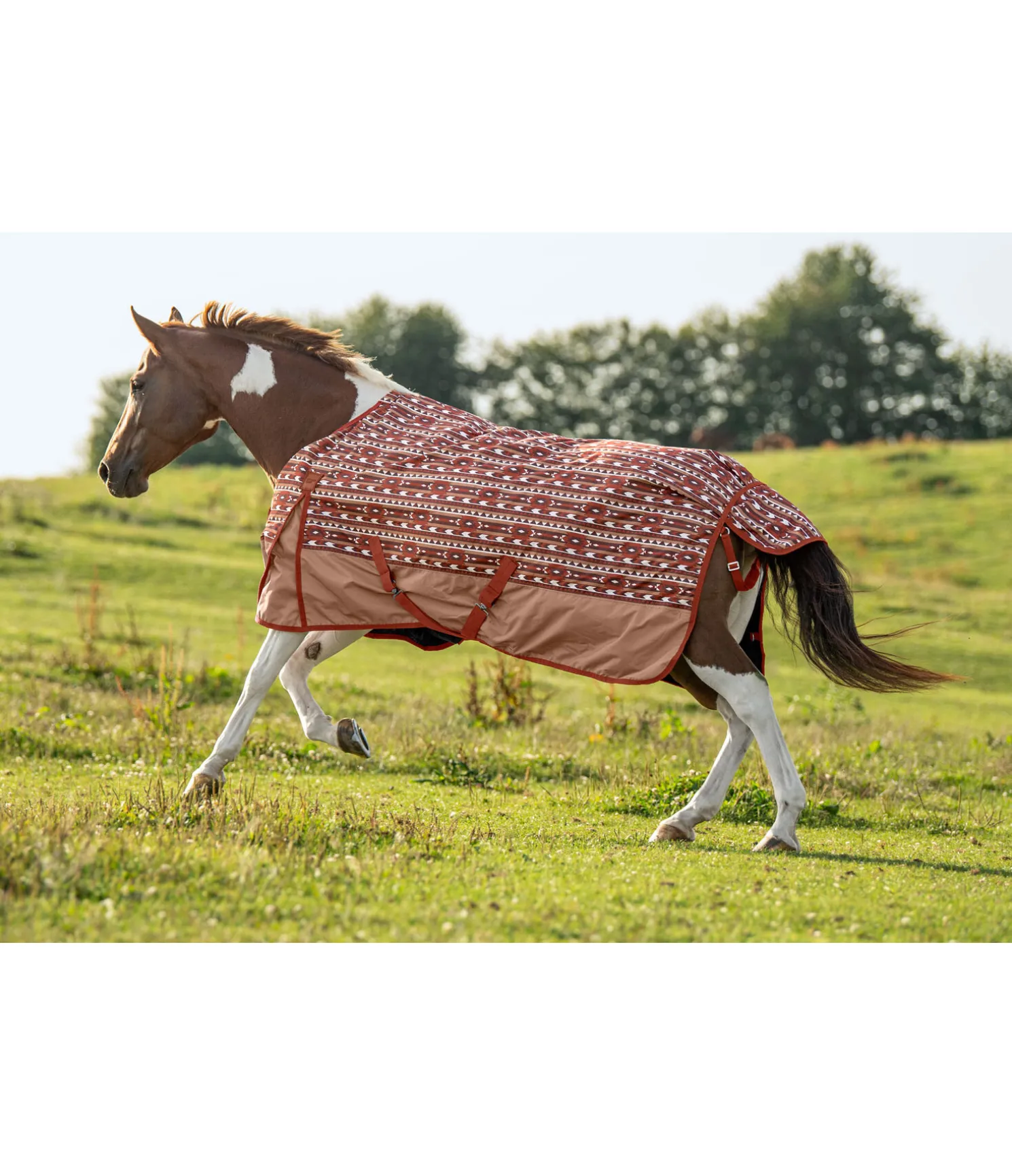 Couverture imperméable sans grammage de type western. Imperméable (3.000 mm) et respirante. Plis d’aisance pour une liberté de mouvement optimale. Double fermeture de poitrail avec crochets en T et patte auto-agrippante, sursangles croisées réglables et rabat de queue. Dispositif permettant la fixation des courroies de cuisses. Courroie de queue réglable en longueur. Doublure intérieure lisse et agréable au toucher. 100 % polyester.