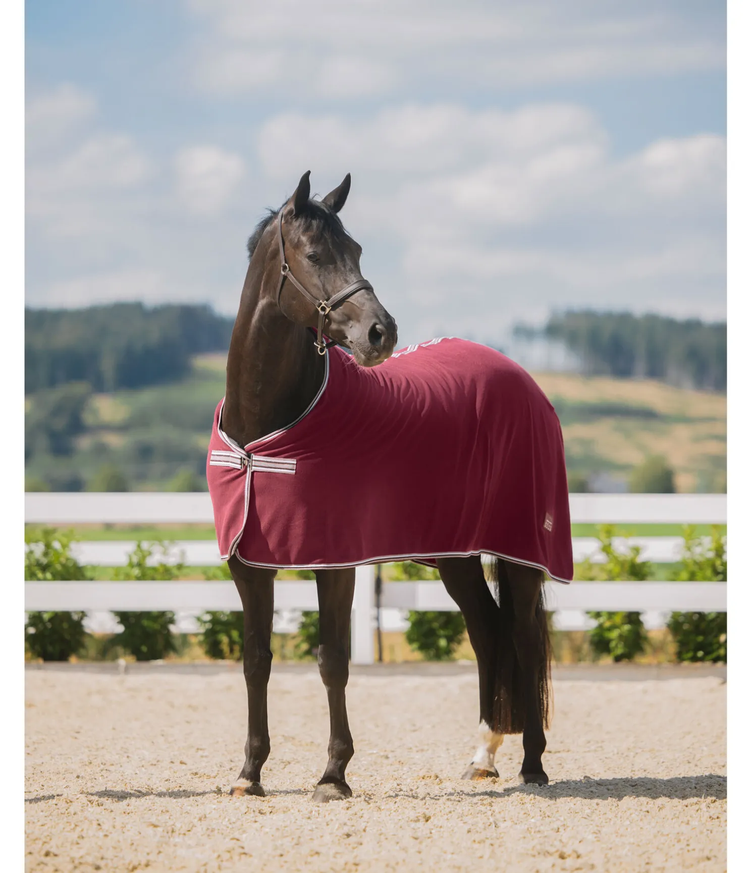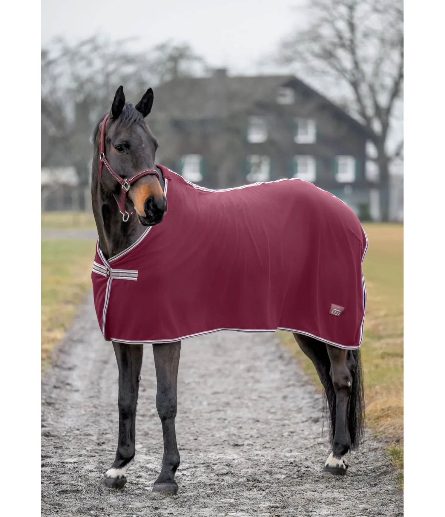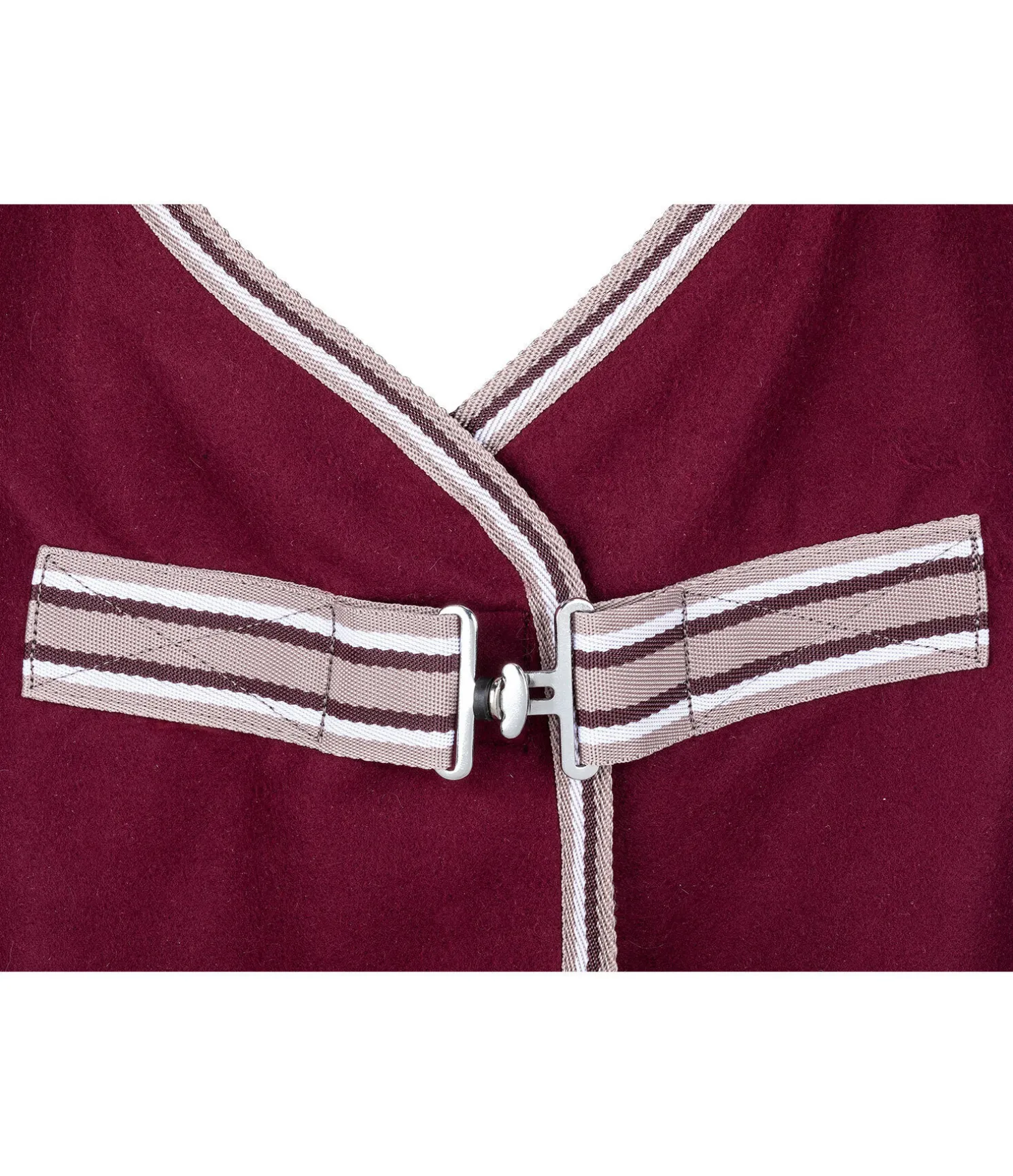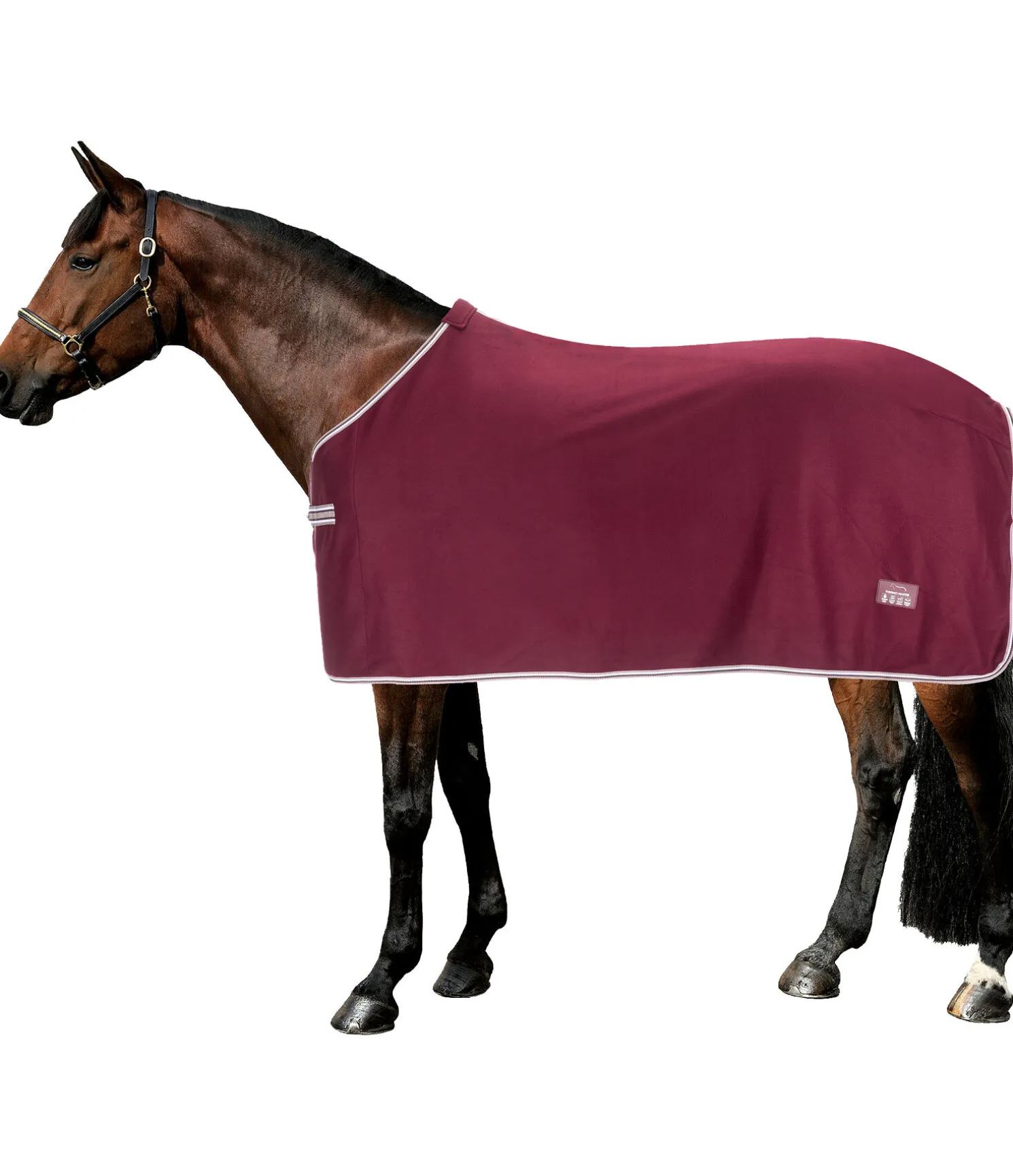Couverture séchante en polaire, simple et élégante. Fermeture de poitrail avec crochet en T. Pad de garrot en polaire douce et doublure lisse satinée au niveau des épaules pour éviter la casse des crins et les irritations dues aux frottements. 100 % polyester.