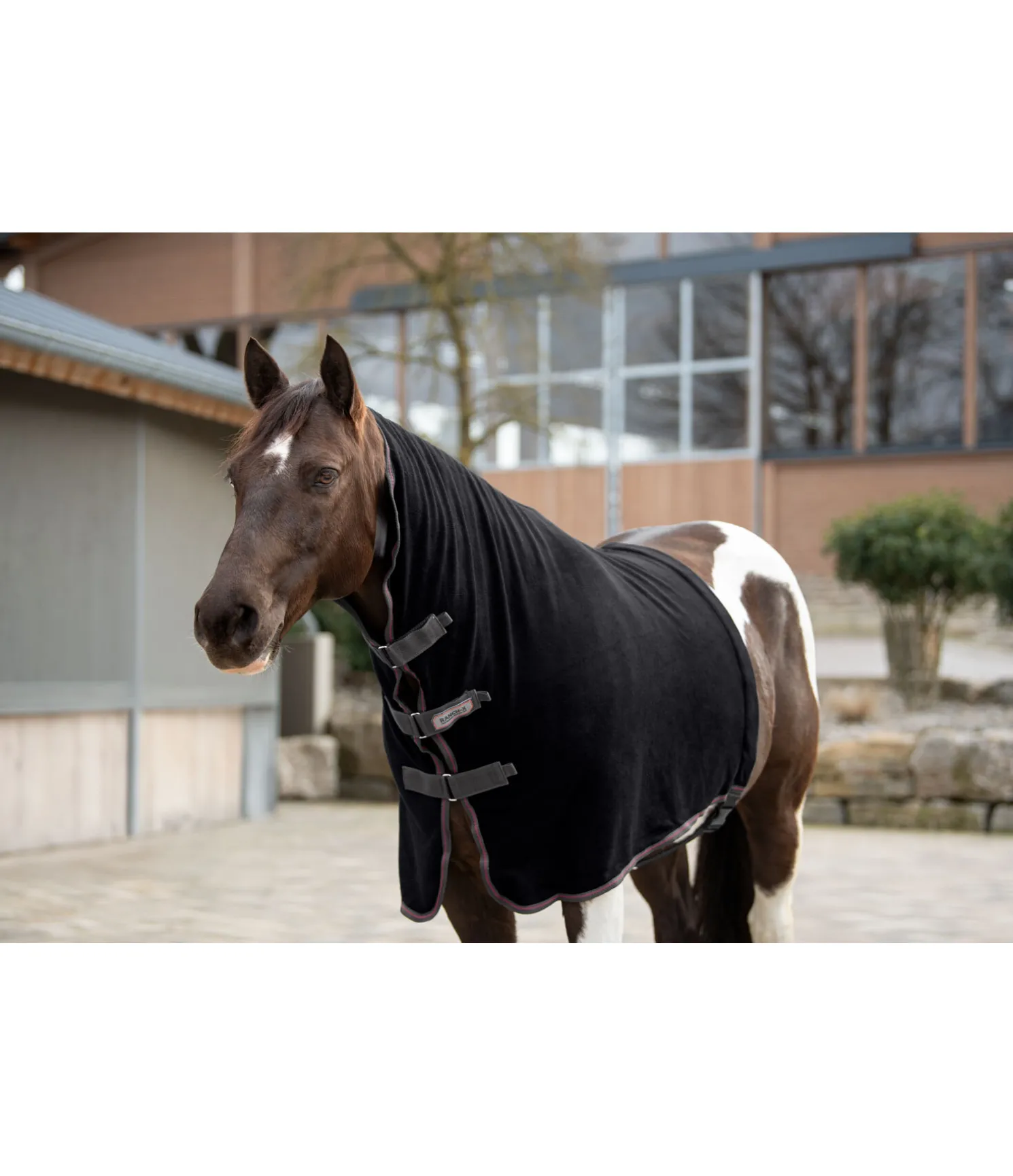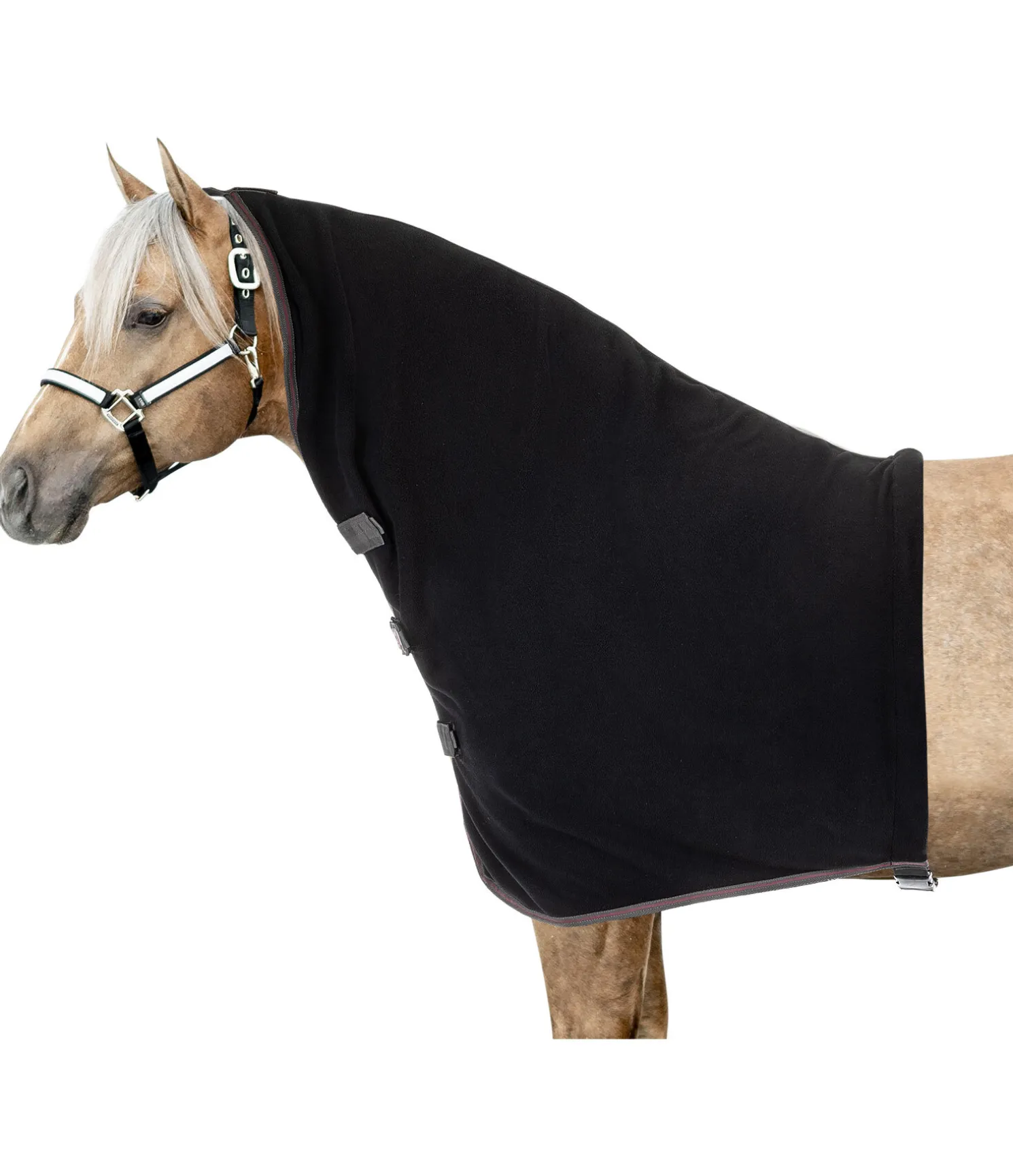 Couvre-cou respirant en polaire douce. Idéal pour les chevaux qui transpirent beaucoup de l’encolure. À combiner avec une chemise séchante ou à utiliser seul. 3 fermetures à l’avant et sangle ventrale pour un maintien optimal. 100 % polyester.