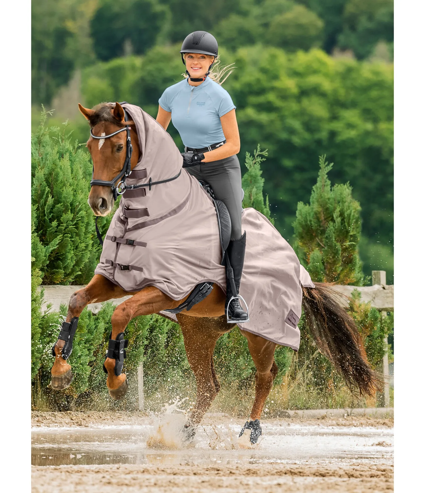 Couvre-reins léger avec couvre-cou. Découpe pour une selle anglaise. Couvre-cou avec 3 pattes auto-agrippantes et languette élastique pour une fixation à la têtière du bridon. Doublure en nylon au poitrail et à la crinière afin de limiter les frottements et la perte de poils. Avec rabat de queue et fermetures à clips au poitrail. 100 % polyester.